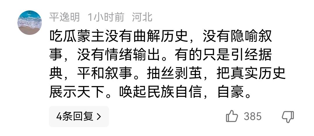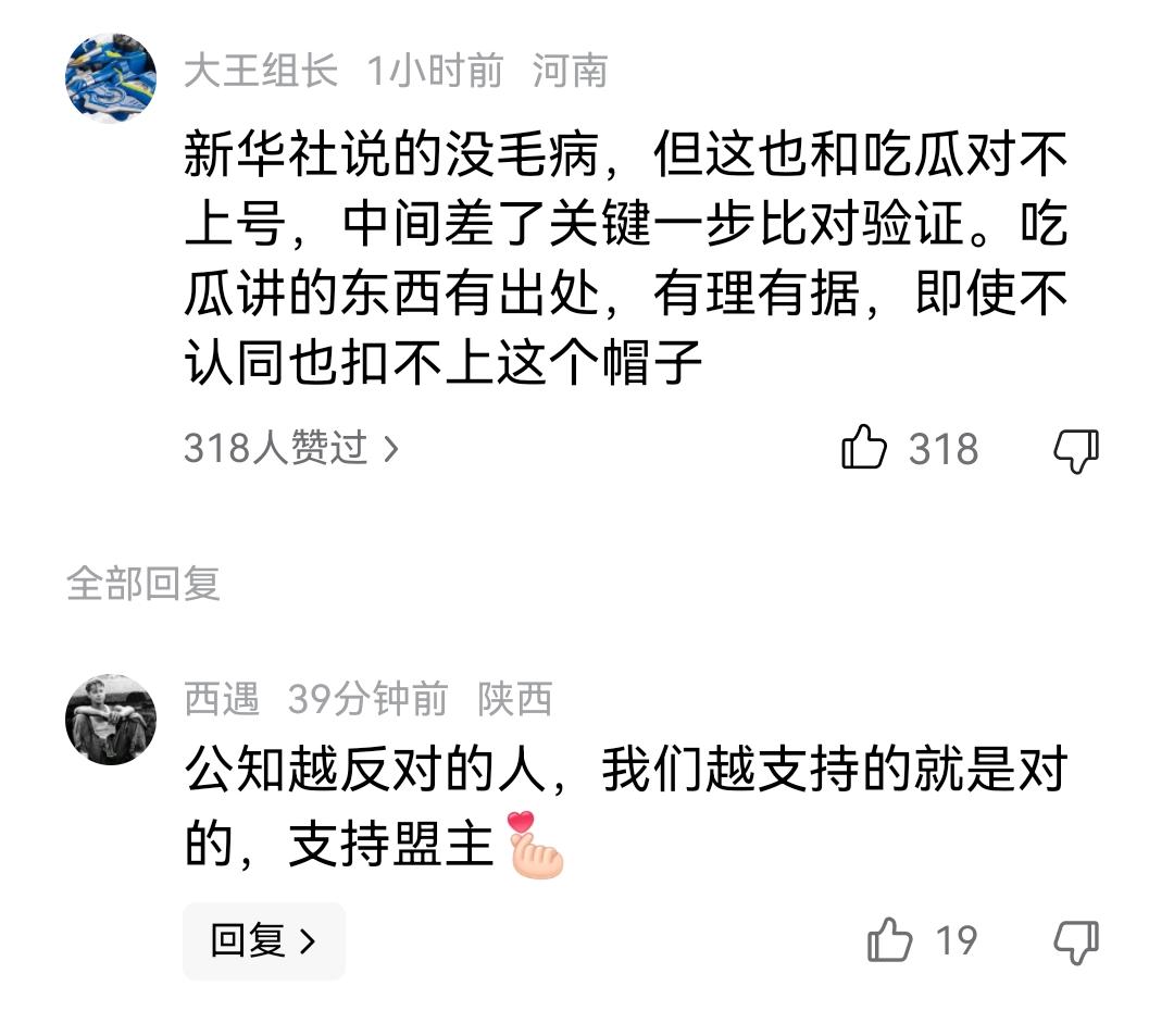 新华社的这个内容,到底是针对谁的?支持吃瓜盟主的,跟反对吃瓜盟主的都激动坏了。 大多数人认为新华社的内容是针对吃瓜盟主这类人的,大家都觉得舆论风气可以改变了。 只是一些吃瓜盟主的粉丝认为,这不是针对吃瓜盟主的,是针对那些曲解吃瓜盟主的人的。他们认为吃瓜盟主说的内容有理有据有出处,是引经据典,不是胡说八道。 看来,还是需要官方更进一步的手段,打击几个行为严重的人,才能把风向彻底定下来。 吃瓜热议 新华社 网络吃瓜乱象 吃瓜公众号 吃瓜时评团 新华社锐评 吃瓜网红圈