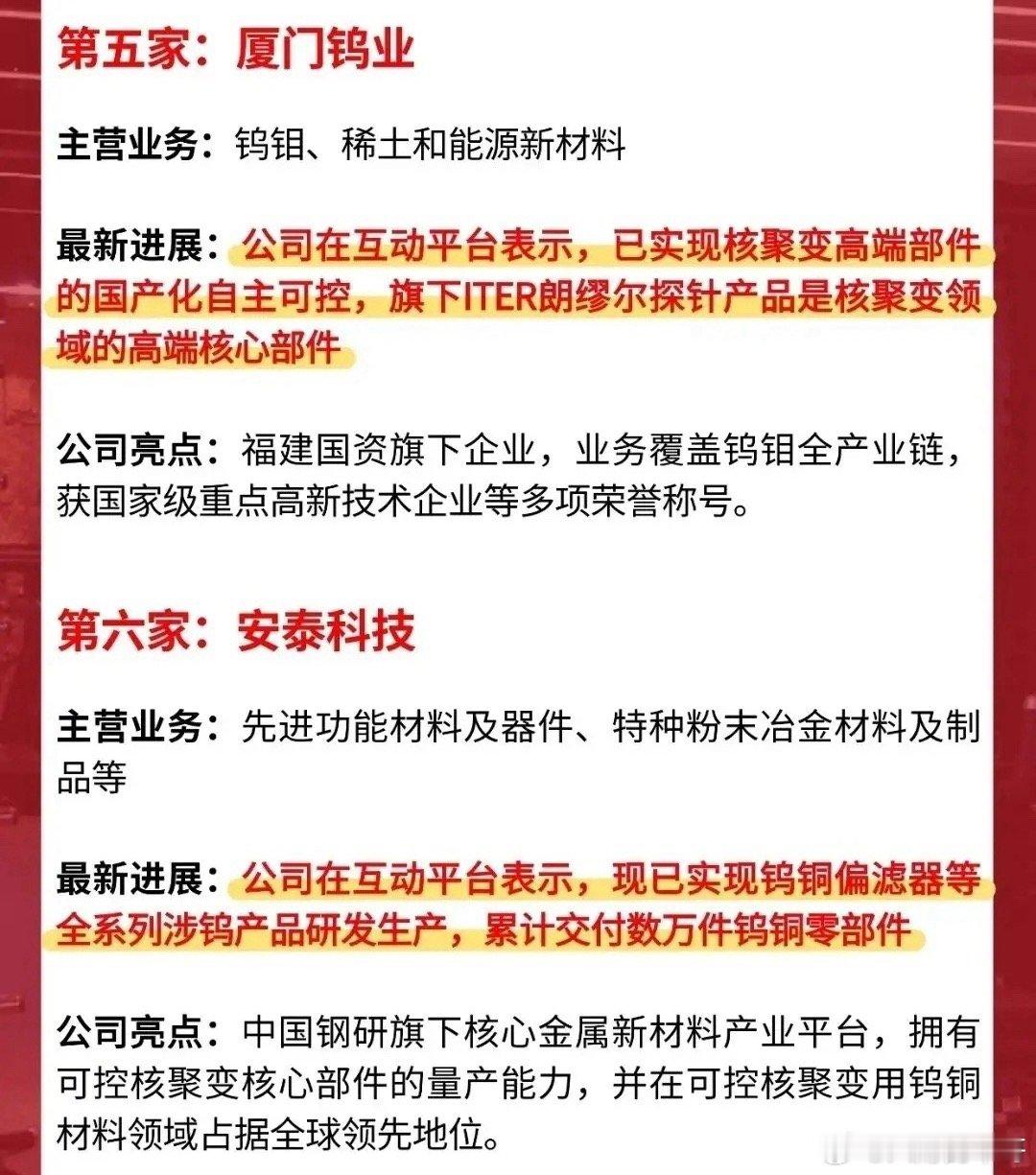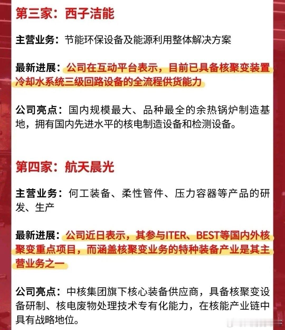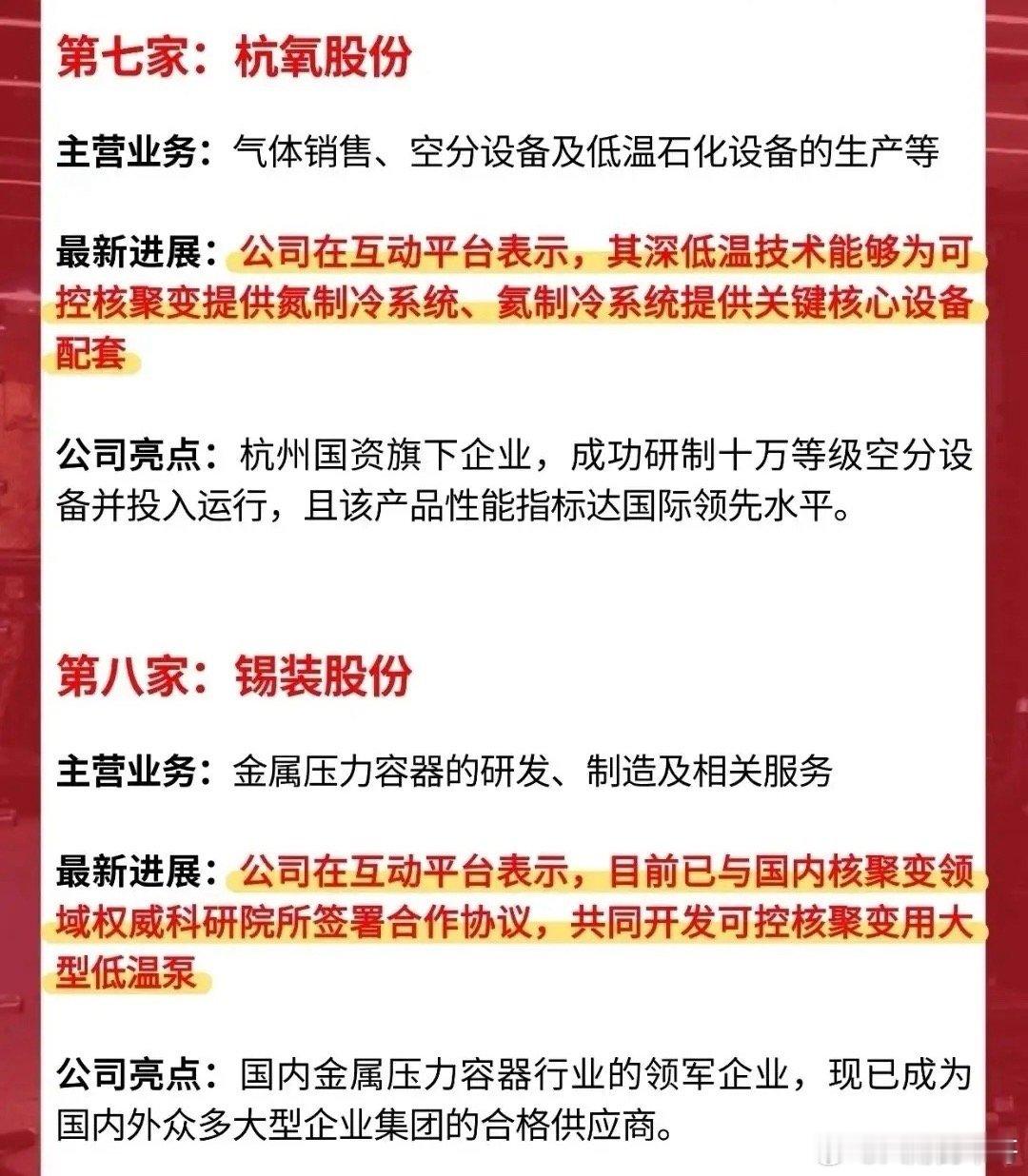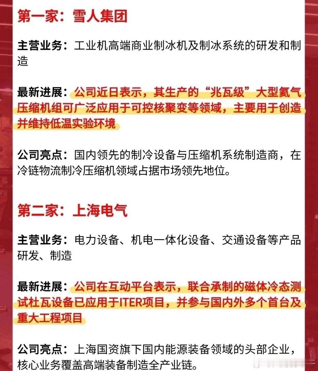 5000亿市场要爆发?这10家公司抢跑可控核聚变!(可控核聚变概念公布最新进展的公司盘点)中法核聚变合作落地,2030年全球市场规模将达3.5万亿元!可控核聚变是解决全球碳中和与能源安全的关键方向,具备不可替代的长期价值,未来有望成长为万亿级市场。相关概念龙头企业值得关注!从制冷设备到激光芯片,10家企业已率先卡位:雪人集团的氦压缩机支撑低温环境,上海电气参与ITER项目,杭氧股份提供深低温系统,安泰科技的钨铜部件全球领先………具体名单见配图。这些企业覆盖“冷、材、能”全链条,从实验室走向工程化,正推动可控核聚变从“科幻”变“产业”。谁能吃下这块万亿蛋糕?