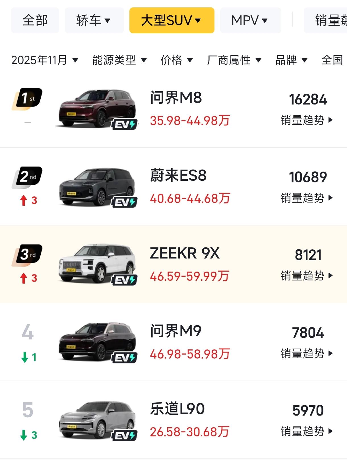 杭州湾库里南,凭借无敌配置,成功爆款了。 11月份,极氪9X卖了8121辆,力压问界M9和乐道L90,成功挤进大型SUV销量前三名。 极氪9X的价格和定位,高于问界M8和蔚来ES8,46.59万~59.99万的售价,比问界M9都要高一些,大型SUV竞争异常激烈,能成功爆款,真的是凭实力得来的。 你能想到的配置,它都给你了,你想不到的配置,也都给你了。 2.0T插混+70度大电池包,同级别没人打得过它。 后续如果能优惠几万,有可能力超越问界M8,成为大型SUV的销量冠军。 实墩墩的一个车,确实威猛!