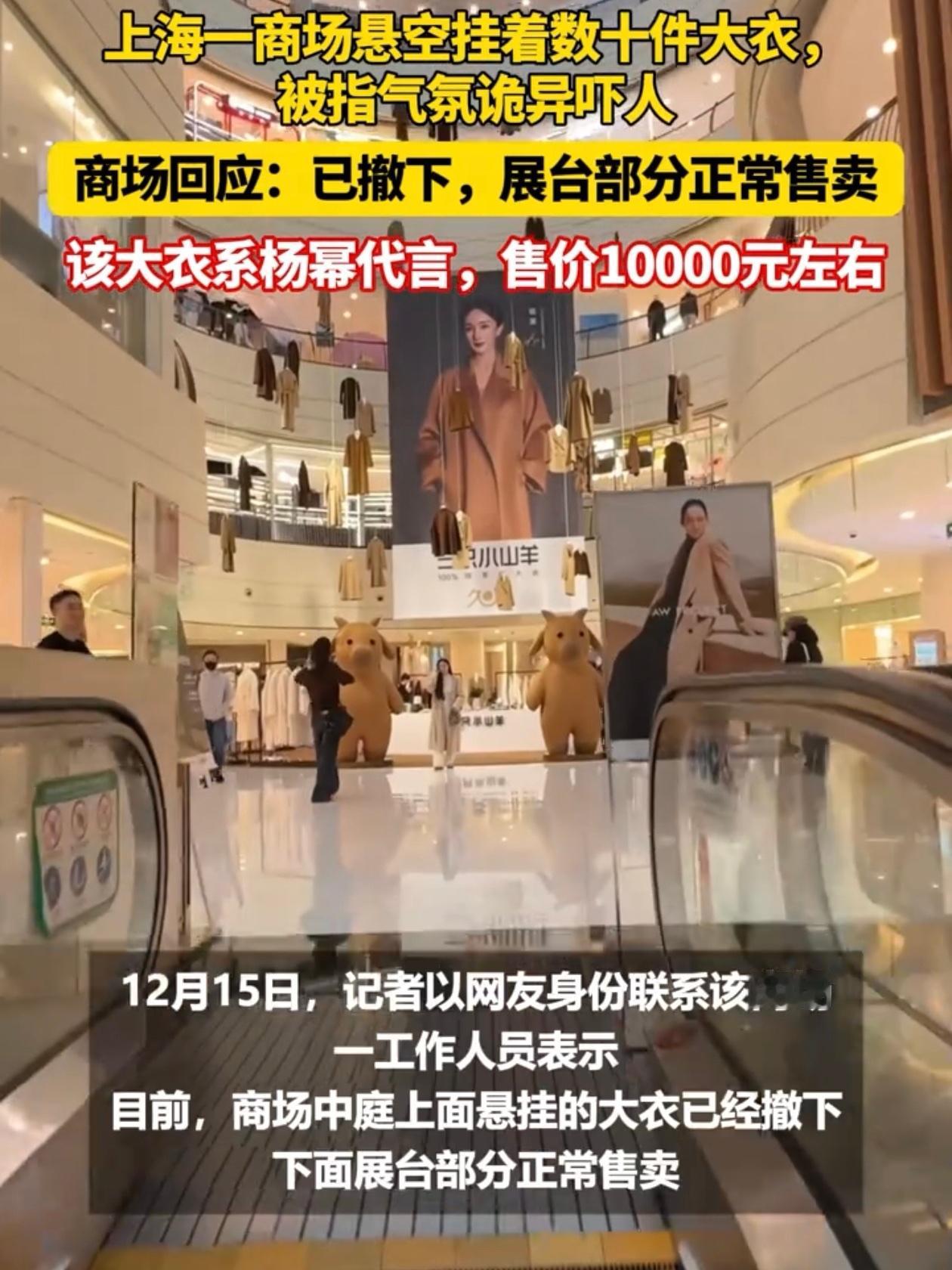 上海久光百货四楼挂了几十件大衣,错落悬空吊在中庭,远看跟吊着几十个人似的,顾客上