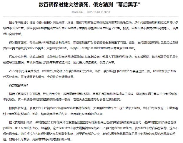 全面“瘫痪”?俄罗斯发生前所未有一幕,足以让中国提高警惕! 莫斯科的早高峰车流里,突然响起一连串急促的鸣笛声,不是因为追尾剐蹭,而是成排的豪车毫无征兆地熄了火。 原本顺畅的车道瞬间堵成长龙,车主们纷纷下车查看,却发现仪表盘亮着、喇叭能响,就是发动机死活启动不了。 数百辆保时捷集体“罢工”,连带着部分奔驰、奥迪和大众也跟着掉了链子,而这一切的矛头,都指向了看不见摸不着的卫星信号。 俄罗斯汽车经销商协会的数据显示,仅事件爆发后的48小时内,全俄就有超过320辆保时捷出现了锁死断电故障。 其中莫斯科城区占了47辆,圣彼得堡32辆,就连远在西伯利亚的叶卡捷琳堡都有19辆。 而全俄最大的汽车经销商罗尔夫,更是被这波故障车潮忙得脚不沾地,他们的维修总监安德烈·波诺马廖夫在接受采访时直言,维修车间的拖车通道就没断过流。 最多的时候,门口排队等维修的故障车能排到三条街外,车间里28位技师连轴转,平均每辆故障车的排查时间都要超过4.5小时。 最开始的时候,维修师傅们是真的摸不着头脑。拆开发动机舱一看,电瓶电压12.7V,完全正常。 检查供油系统,喷油嘴压力达标,燃油泵也没毛病;就连线路接头都拆下来擦了一遍,没发现任何松动或者氧化的痕迹。 更让人不安的是,故障范围还在不断扩大,俄罗斯汽车联合会很快发出警告,除了保时捷,部分搭载同类系统的奔驰、奥迪和大众也出现了相同的锁死症状。 照这个趋势,受影响的车辆数量可能会飙升到数千辆。 有位干了15年汽车维修的老技师,拿着专业诊断仪反复读取故障码,最后只跳出一个“卫星认证失败”的提示。 他抱着试试看的心态,拔掉了车辆自带的VTS卫星安防模块的插头,再拧钥匙点火,那辆趴窝了3个小时的保时捷,竟然“嗡”的一声就启动了。 说白了,这些豪车都装了一套“电子保安”系统,也就是卫星追踪安防模块。 这套系统得靠GPS卫星信号定位,还得每隔24小时跟欧洲的远程认证服务器“报个平安”。 要是连续3次接收不到清晰的卫星信号,或者跟远程服务器断了联系超过1小时,系统就会判定车辆被盗窃或者劫持。 直接触发最高级别的防盗指令——切断发动机控制单元(ECU)的供电,把引擎死死锁死。 而奔驰、奥迪和大众之所以跟着出问题,是因为它们用的卫星安防系统,跟保时捷的VTS模块是同一个厂商生产的。 底层通信协议、锁止逻辑全一样,就连依赖的卫星通信频段和认证服务器都是共用的,相当于一条绳上的蚂蚱,只要卫星信号出岔子,全得跟着“掉链子”。 至于卫星信号为啥突然就不正常了,现在各方说法都不一样,还没个定论。保时捷俄罗斯官方发了个声明。 说是外部环境的信号干扰导致系统误判,不是车子本身设计或者制造有问题,还给出了临时解决方案:把防盗模块拆下来重启,再重新匹配车辆信息就能用。 俄罗斯汽车安全领域的权威专家德米特里·库尔恰诺夫,在接受俄国家电视台采访时就直言:“从技术层面来讲,通过定向干扰卫星信号,或者对远程认证服务器发起DDoS攻击,让这些车辆集体锁死,完全能实现。” 他还透露,自己团队已经检测到,故障发生时段,莫斯科、圣彼得堡等城市上空,GPS L1频段的信号强度比平时低了67%,还出现了大量的虚假信号。 罗尔夫经销商的维修总监也补充说,他们排查过近百辆故障车,没有一辆是因为模块硬件损坏或者线路故障,全都是卫星信号接收异常导致的系统误判,虽然现在没有直接证据证明是故意干扰,但这种可能性绝对不能排除。 其实这场看似偶然的豪车集体趴窝,藏着一个特别可怕的隐患:咱们花大价钱买的车,核心控制权可能压根就不在自己手里。 就像这次受影响的车主,车是自己的,钱是自己花的,但能不能启动、能不能开,居然要靠国外的卫星和远程服务器说了算。 一旦国际局势有变化,或者有人故意搞破坏,这些原本用来保障安全的配置,分分钟就能变成制约咱们用车的“枷锁”。 更值得警惕的是,这种风险绝不仅仅局限在汽车领域。 随着智能化、网络化的普及,越来越多的基础设施、智能设备都依赖卫星定位和远程通信。 小到家里的智能家电,大到城市的交通系统、能源网络,都可能因为类似的信号干扰或远程操控出现问题。 当卫星信号可以决定一辆车的生死,当远程服务器可以掌控基础设施的运行,技术主权就成了不能忽视的关键。 对于正在智能汽车领域快速发展的中国来说,这一幕更值得深思,如何构建自主可控的卫星导航系统、车载控制系统和通信网络。 如何在智能化升级的同时守住安全底线,已经成为必须面对的重要课题。 毕竟,只有把主动权握在自己手里,才能避免重蹈覆辙。 信源:中国新闻网2025-12-08——《数百辆保时捷突然锁死,俄方猜测“幕后黑手”》