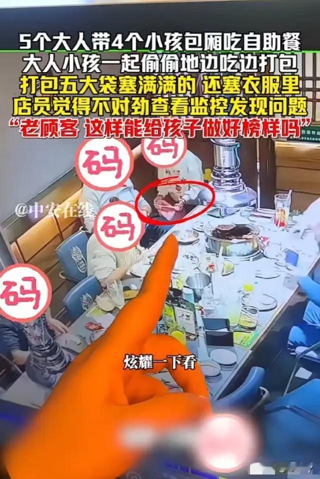 一家自助餐厅里,来自三个家庭的五名大人带着四个孩子他们选择了餐厅的一个包厢! 几个人吃了好久,退完押金后匆匆离开了餐厅! 店员感觉不对劲,几个人来的时候没看到拿着那么多包,怎么走的时候五个大包都装得满满的背着走了! 店员赶紧拿出小票,一看几个人的消费记录吓了一跳!榴莲点了41份,22份三文鱼,捞汁章鱼须11份,捞汁扇贝肉11份等等,还有很多其他食材,几乎都是10份起步! 店员赶紧将此事报告给店长,店长调出了监控录像!原来几个人来的时候都带着袋子,落座后看得出来袋子都是空的! 吃饭期间,小朋友就开始打包食材,一个小朋友还把装好的袋子拿到爸爸跟前,向爸爸炫耀自己的战利品! 紧接着大人也开始帮忙打包,把整盘的榴莲倒进了包里!最后五个包装得满满的!还有一些食材实在装不进去了,大人就将食材包裹起来塞在了羽绒服里! 据店长说这几个人还是店里的老顾客,做出这样的事儿以后还敢到这个餐厅来吃用餐吗? 几个大人当着孩子的面做出这样的举动,这是在给孩子树立什么样的好榜样啊!