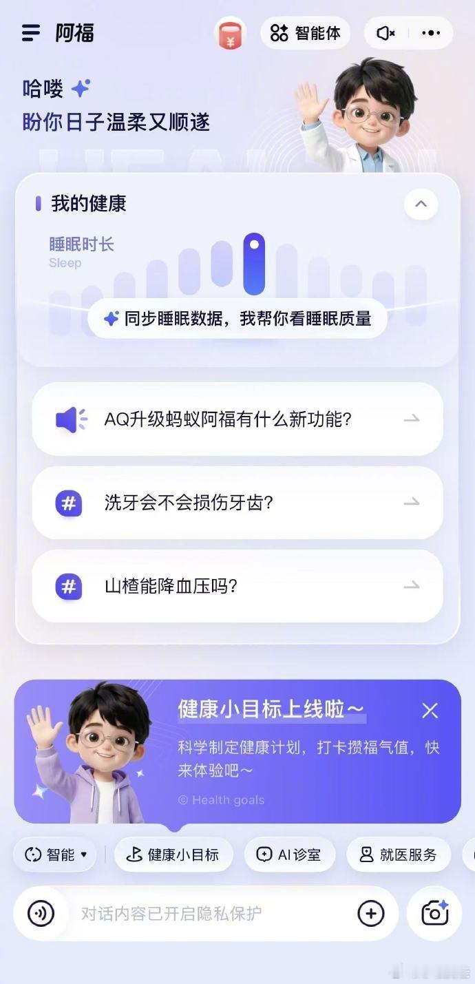 阿福从智能手表里读懂了我的睡眠 每次用智能手表,都会因为数据散落在不同App里而苦恼。直到用了新版蚂蚁阿福,它接入了我的智能手表后,把零散数据变成了完整的健康档案。更贴心的是用它同步了家里老人的设备,可以直接看到家中长辈的健康状态,比如心率、睡眠等情况。 当有健康问题想咨询医生时,可以直接用阿福里的AI医生请回答功能。我描述了情况,连线了平台上一位名医的AI分身。很快就得到了一些专业的分析和建议,心里也踏实了不少。现在,阿福还能根据实时数据,制定改善健康的小目标并每日提醒。有了阿福似乎多了一种安心的陪伴,时刻守护你的健康,快上支付宝搜“蚂蚁阿福”,更新APP后试试看吧~AI医生请回答