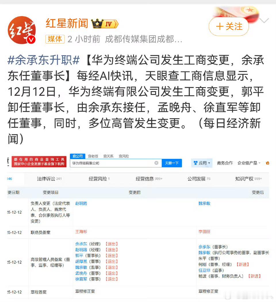 孟晚舟卸任华为终端公司董事 这新闻无聊得很,余承东担任华为终端董事长已经很长时间,发布会这个头衔都用一年多了。这只是工商变更,并没有实际上的职位变更。华为在工商注册的,主要是对外合规,和内部管理体系两码事。现在终端余总管,他把对外合规管理起来。倒是鸿蒙智行大饭店,据说被一些人举报属于内卷,不能搞了。我以前好像也没有去说过这个事情,因为感觉不去说这个服务更好,还是要给真正需要的客户用就行,不跑偏。因为成本运营很高,真的天天排队影响体验的。