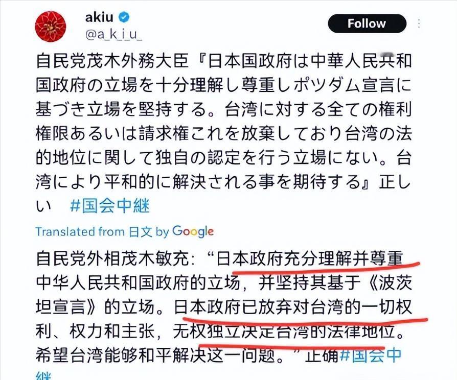 日本低头了!12月15日,日本外务大臣茂木表示:日本政府充分理解并尊重中华人民共和国政府的立场,坚持基于《波茨坦公告》的相关主张。日本已放弃对台湾的一切权利、权限及诉求,并未就台湾的法律地位持有独自认定的立场。日方期待台湾问题能够由相关方和平解决。 日本这边,先是首相高市早苗在国会答辩时老爱拿1951年的旧金山和约来说事,强调日本只是放弃了对台湾的权利,没法自己认定台湾归谁。 这话一出口,立刻戳中了中国这边最在意的地方,因为中国从来不认这份没让自己参加的片面和约。 中国外交部直接点名批评,日本故意避开那些明确把台湾归还中国的历史文件,就是在故意模糊立场。 台湾问题牵扯到二战后的国际安排。日本在1895年甲午战争后强占台湾,五十年殖民统治结束后,二战盟国在1943年开罗宣言里清楚写明,日本偷去的领土包括台湾必须还给中国。 两年后,波茨坦公告又重申了这点,日本投降时也签字承诺遵守这些条款,1945年10月,台湾正式光复,重回中国怀抱,这段历史铁板钉钉,谁也翻不了案。 可冷战一来,美国为了拉拢日本,1951年在旧金山搞了个单独对日和约,没请中国也没请苏联,只让日本放弃台湾权利,却没说归谁。 这份和约从一开始就被中国视为非法无效,因为它违反了盟国不单独媾和的约定,也背离了开罗和波茨坦的精神。 很多国家当时也没买账,日本后来在1972年中日建交联合声明里,明明白白表示充分理解和尊重中国立场,坚持遵循波茨坦公告第八条,那就是承认台湾归还中国的安排。 高市早苗上台后,日本在台湾问题上开始冒头,她不止一次把台海局势跟日本安全挂钩,甚至暗示如果台海出事,日本可能得卷进去。 这让中方警铃大作,因为日本作为二战战败国,本该老实遵守战后秩序,别再插手中国内政。 可高市偏偏反复提旧金山和约,回避联合声明里的关键承诺,等于在试探底线,中国这边连续表态,强调日本别忘了历史责任,别拿非法文件挑战公认事实。 压力越来越大,日本国内也有人觉得这样搞下去对两国关系没好处,日美同盟固然紧密,但日本经济离不开中国市场,民间交流也热络得很,继续硬扛,只会两头不讨好。 到了12月15日,外务大臣茂木在议会答询时,终于松口了,他明确说,日本政府充分理解并尊重中国立场,坚持基于波茨坦公告的相关主张。 这番话跟高市之前的调门比,明显软了下来,直接点名波茨坦公告,不再只盯着旧金山和约,等于承认了那些奠定台湾归属的国际文件效力,这不是小调整,而是日本在强大压力下做出的让步。 中国这边一直强调,中日四个政治文件是关系基础,日本必须老实守诺言,茂木这表态,至少在表面上往回拉了拉,避免关系进一步下滑。 日本政坛复杂,右翼声音一直存在,从上世纪90年代起,日本就慢慢淡化波茨坦,突出旧金山,配合日美军事合作,把台海纳入考量范围。 近年来,日本防卫预算大增,自卫队动作频频,美日联合演习也越来越针对台海,这些动作背后,是日本想借美国力量提升自身地位。 可现实是,日本经济深度依赖中国,供应链离不开大陆市场,老百姓最关心的还是生活稳定,不是卷入冲突。 茂木表态后,中日关系有了喘息空间,但根子上的分歧还在,日本如果真想缓和,就得在行动上匹配言论,别一边说尊重一边继续小动作。 台湾问题是中国的核心利益,容不得外人指手画脚,中国统一是大势所趋,和平最好,但绝不怕硬碰硬。 中日两国邻居一场,合作空间巨大,经贸往来上万亿,民间互访无数人次,大家都希望和平发展,日本这回调整立场,是明智选择。 希望借此机会,两国关系稳下来,一起把精力放在民生和区域稳定上,中国人向来重信守诺,日本也该记住1972年的承诺,和平解决台湾问题,才是对历史负责,对民众负责。 日本这次表态是个积极信号,说明压力管用,中国立场坚定就能维护权益。 大家说呢?欢迎评论区聊聊你的看法。