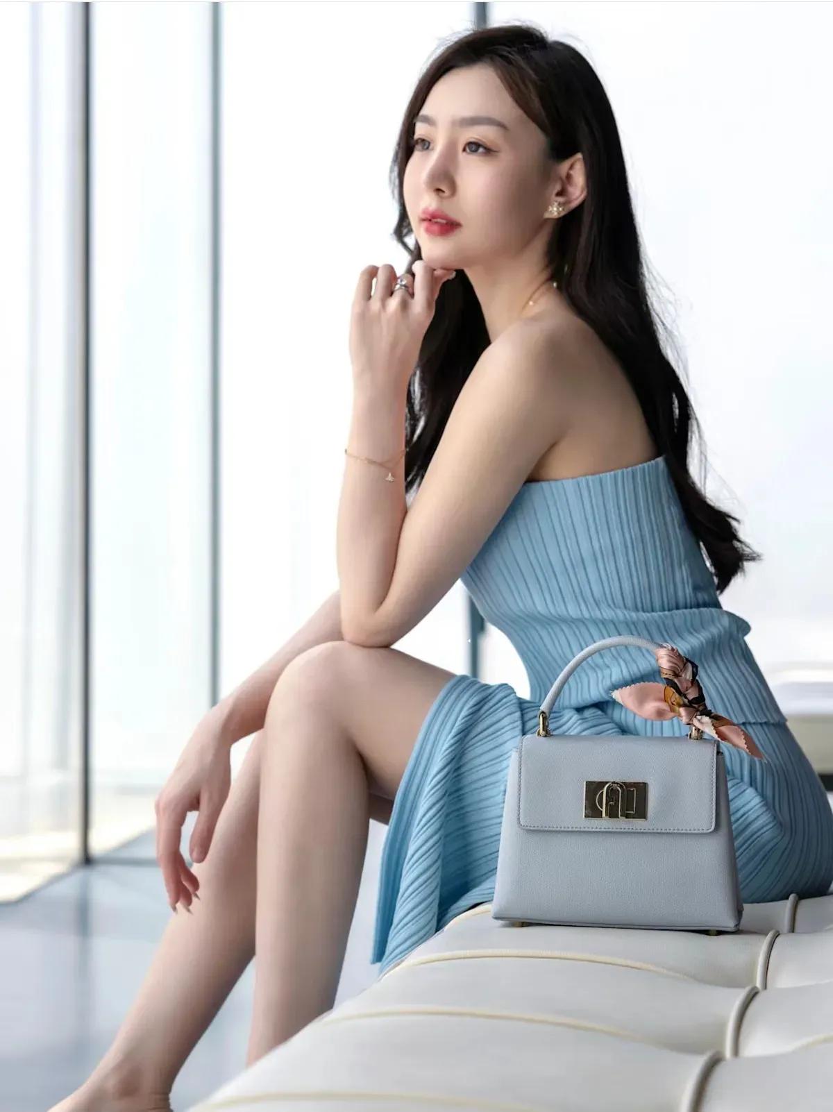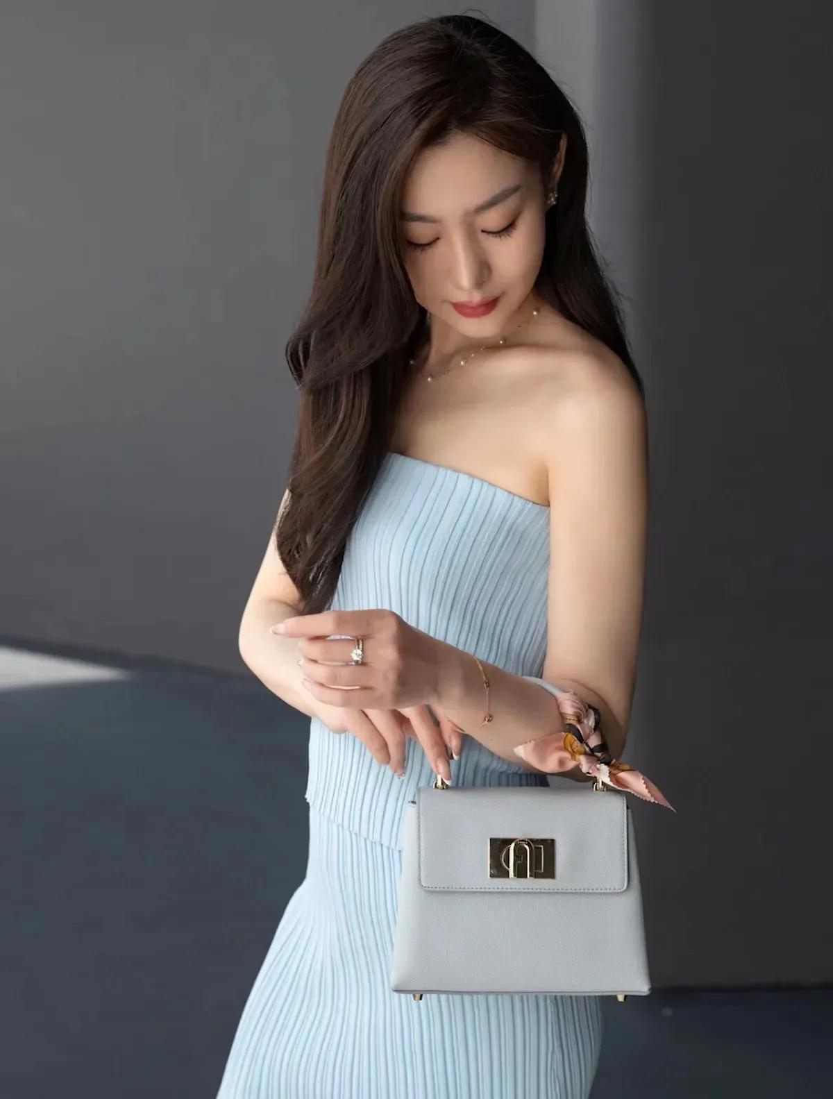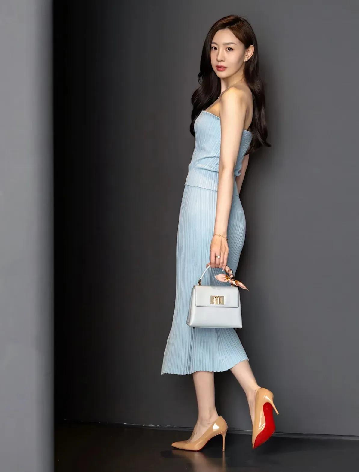 这套穿搭是温柔高级的浅蓝褶皱抹胸裙风,清新又带优雅气质,适配轻奢休闲场合。浅蓝色抹胸褶皱长裙自带清新温柔感,竖纹褶皱设计修饰身形,开叉细节增添了恰到好处的魅力;抹胸款式凸显肩颈线条,是春夏轻正式场合的适配选择。 浅灰色手提包与裙装色调呼应,提升整体和谐度;裸色高跟鞋简约精致,让造型更显轻盈利落;简约首饰点缀,强化了优雅质感。能充分展现穿着者温柔高级的轻熟魅力。浅蓝长裙
