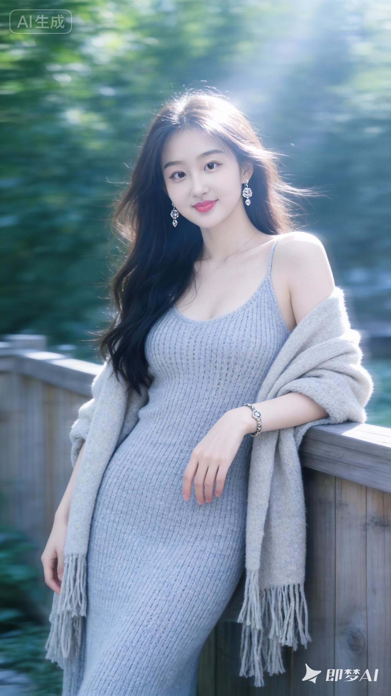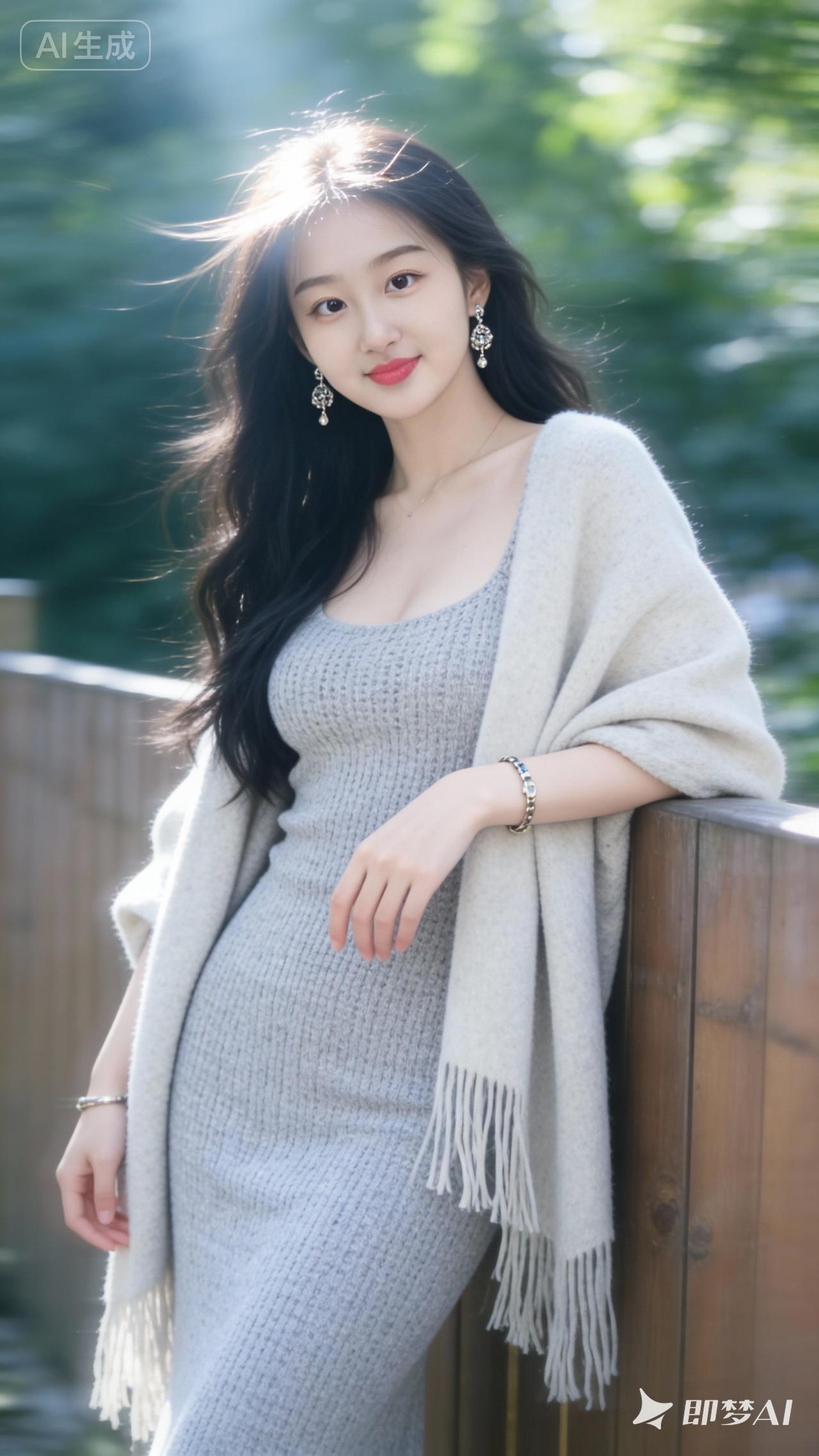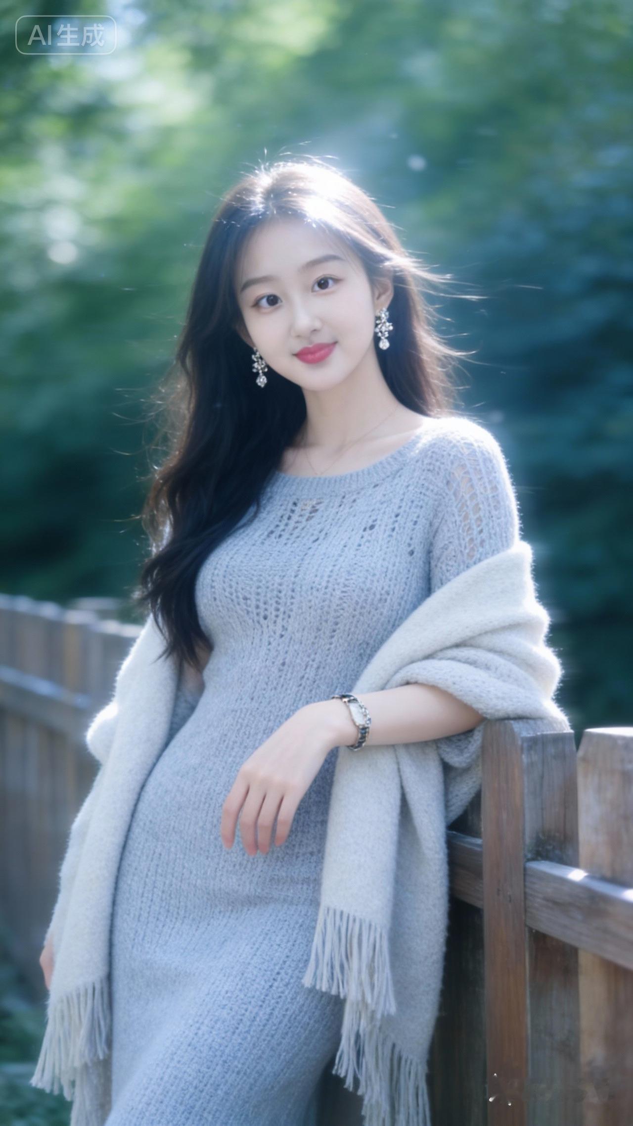 一位棕色长发及腰、模样可爱的冷白皮女生,身着冬季随机搭配合理穿搭,其软糯的质感和清晰的层次十分突出
