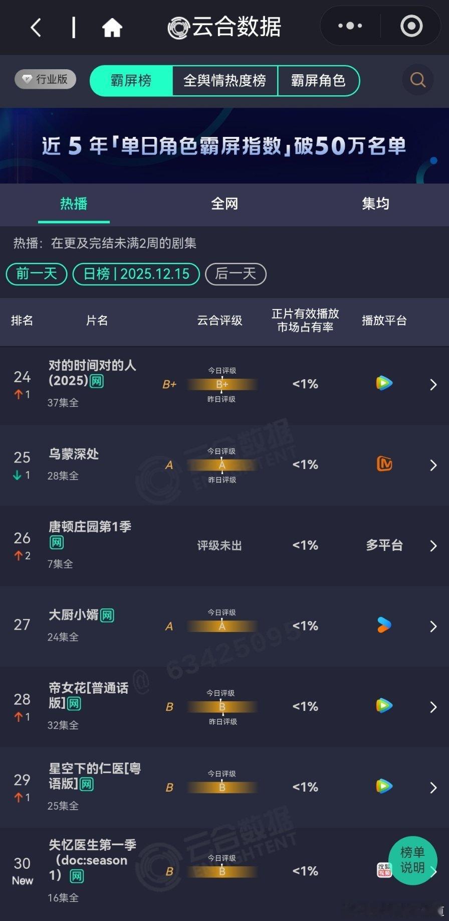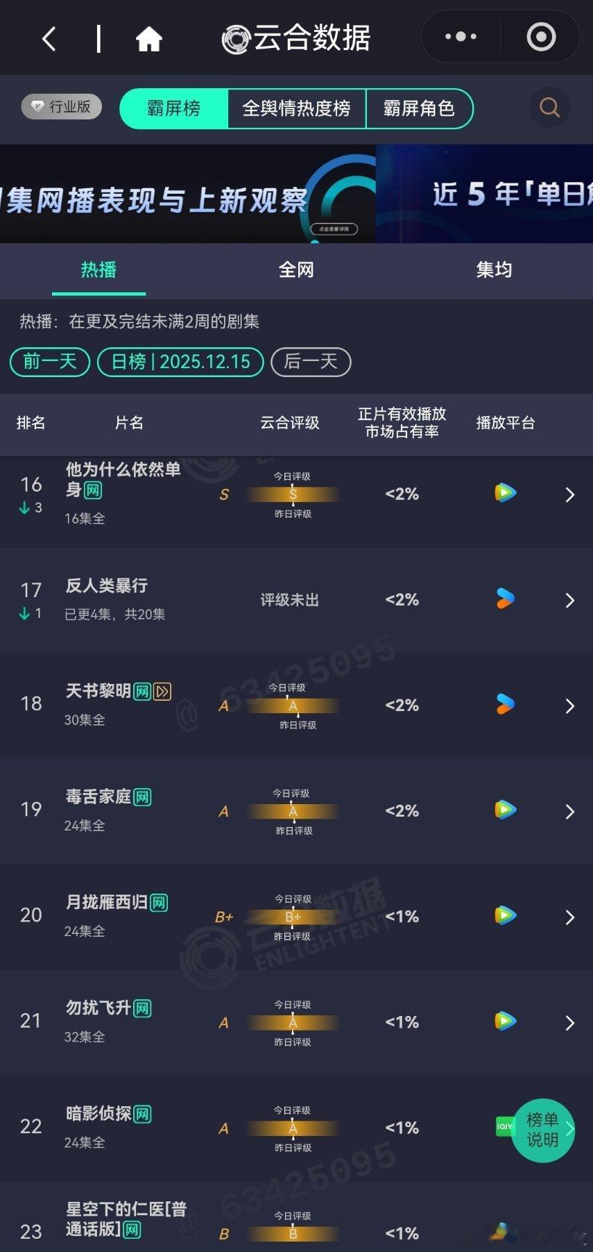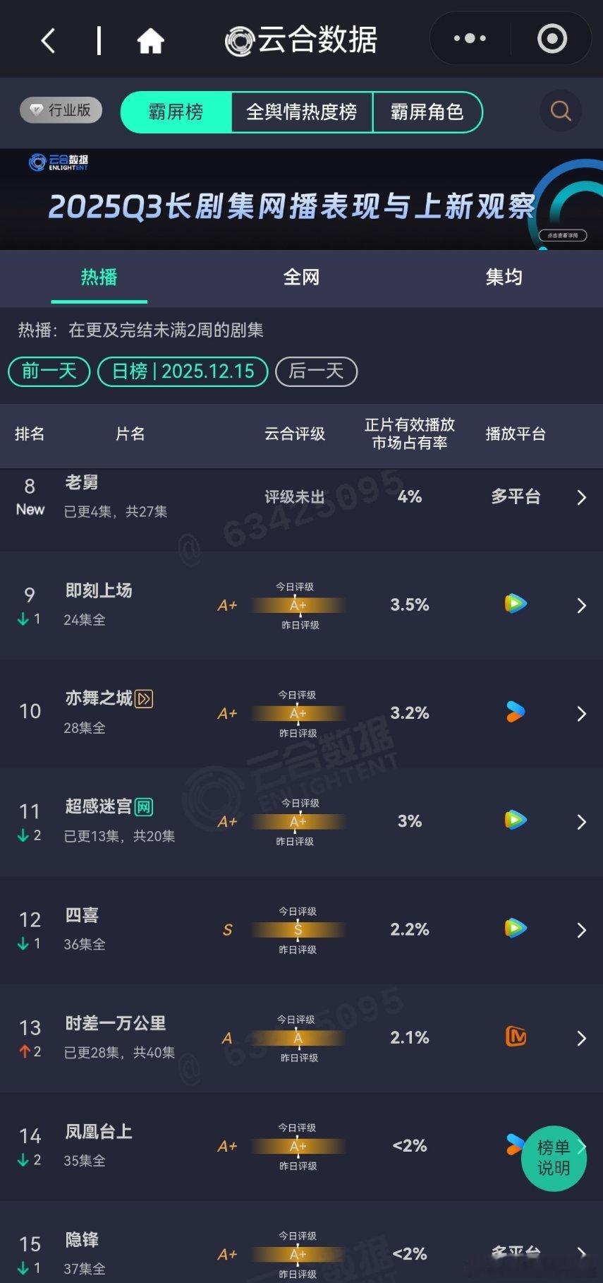 12月15日云合播放占比云合狙击蝴蝶15.1%上了几部剧了,结果是一个A级剧登