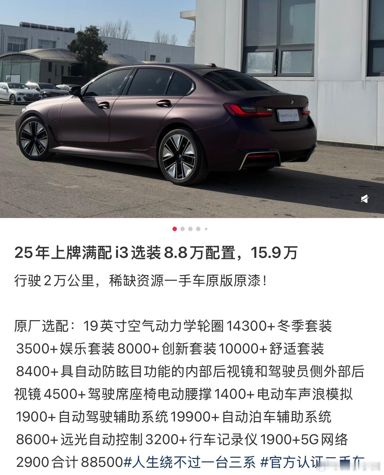 25年上牌2万公里选了8万多的配置原版原漆现在二手车15.9万?!看了下选配真丰富,大轮圈、舒适套装、创新套装还有非常好用的辅助驾驶系统新车当年指导价+选完这些要40万……大概率官方试驾车,个人车不会选这么多就说二手i3优惠巨大这个15.9还是有点让我惊讶买电车除了新车可以多翻翻准新二手真的有惊喜啊我和汽车的日常 北京