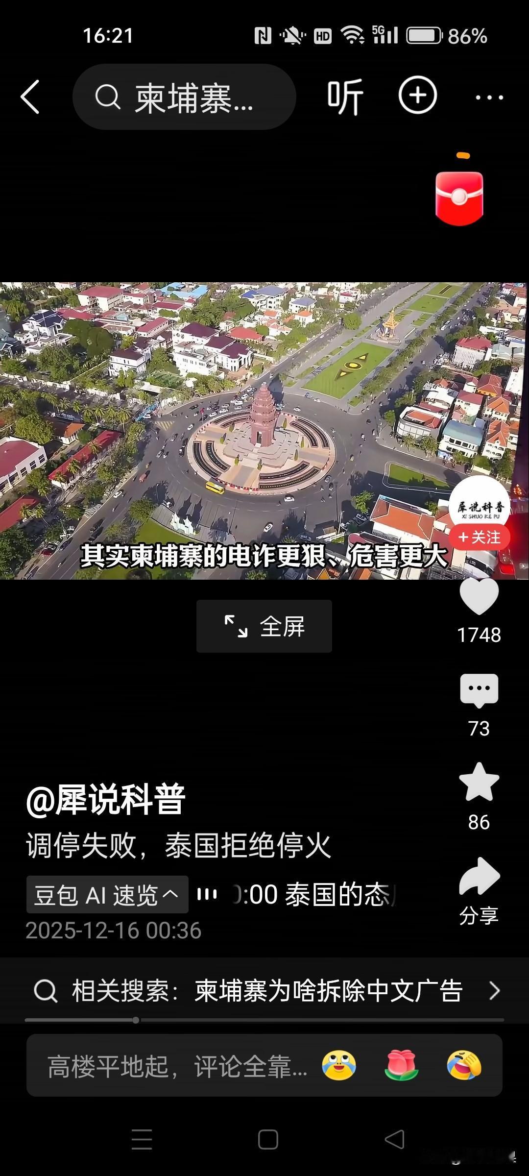 泰国、柬埔寨交火。泰国势头正猛,不接受他国调停,主攻柬埔寨的电诈园区。电诈园区被摧毁,变相的也造福其他国家被诈骗人员。电诈窝点捣毁了,没有了落脚点,电诈团伙无处藏身!世界上,每年有很多国家的年轻人被不知不觉骗到那里,有的还丢了性命。