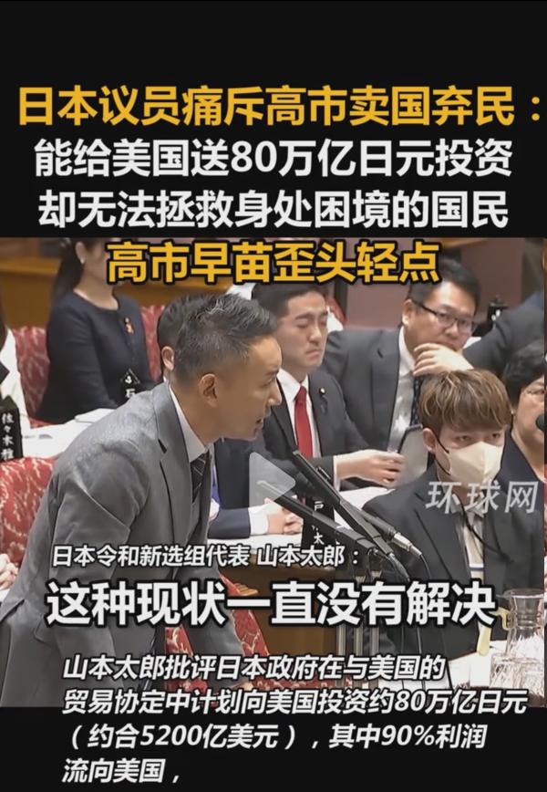 日本议员痛斥高市早桥卖国弃民:能给美国送80万亿日元投资,却无法拯救深处困境的国民,高市早桥歪头轻点。 2025 年 12 月 15 日,日本国会参议院预算委员会上演激烈一幕:令和新选组参议员山本太郎拍案而起,直指首相高市早苗痛斥:"能给美国送 80 万亿日元投资,却无法拯救深处困境的国民,这不是卖国弃民是什么?" 高市早桥"歪头轻点"代表什么?日本政治的隐喻。 高市早苗的 "歪头轻点",恰似日本当前政治困境的隐喻: 对美国:点头哈腰,卑躬屈膝,牺牲国家利益换取政治保护 对国民:歪头漠视,充耳不闻,任凭民众在物价上涨中挣扎 对山本太郎:你给我等着,老娘背后有人有的是办法整你。 这一微小却极具象征意义的动作,彻底暴露了高市政权的本质:为了政治野心与美日同盟,不惜出卖国家经济主权和国民福祉。 日本还有山本太郎如此清醒的政治人物这是日本之幸,可对美国来说可是不幸的的啊,可能对山本太郎也是不幸的,在当前的日本政治生态上恐怕很能走远。