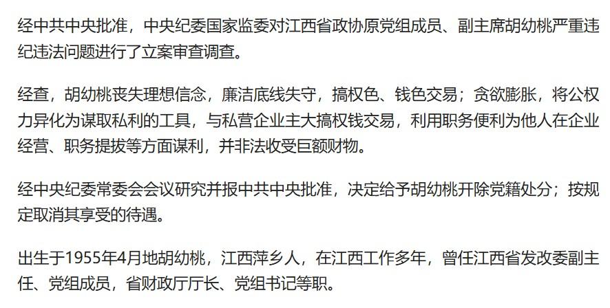 官员的腐败往往会与钱和色联系起来,往往一是贪财,二是好色,就是用是用权力交易。胡幼桃是典型的贪财好色之徒,而且搞权色、钱色交易,也就是说他替女性办事要人家献身,还自己用钱买春甚至包养别人。如此道德败坏的人能够走到部级高官,真是让人痛恨。胡幼桃是长期管钱,曾经当了七年江西财政厅长,而且当了副省长后也管财政,这样的干部腐败特别可怕。年界70岁、退休7年后被查,说明只要有事肯定就跑不掉,莫伸手,伸手必被捉。