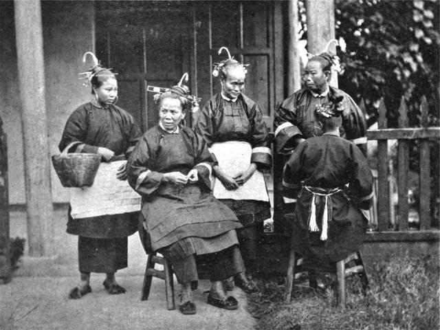 这是一张1880年福州茶园周边女性日常的影像,照片取景于茶园旁的民居檐下,她们后面的是木质门栏,外侧是带着草意的户外地面,是当地女性劳作间隙休憩的日常场所。 几位妇人皆着福州地区的传统服饰,她们的发髻尤为醒目,插着精巧的头饰,中间端坐的妇人神态松弛,似是群体中的长者;旁侧是手提竹篮的妇人。