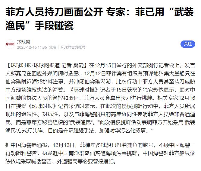 菲律宾“渔民”胆子太大了!居然敢持刀威胁中国海警! 在12月15日的外交部例行记者会上,发言人郭嘉昆对外透露,12月12号那天,有好几艘菲律宾船借着捕鱼的名义,无视中国海警的多次劝阻和警告,非要闯进我国南沙群岛仙宾礁海域找事。 中国海警依法对其进行喊话劝离、外逼驱离等管控措施,没想到菲方人员竟然掏出刀具,公然威胁现场执法的中国海警队员。 这事换谁看了都会气愤,这根本不是什么正常的捕鱼行为,分明是一场早有预谋的挑衅碰瓷!更值得警惕的是,菲方这是摆明了要用“武装渔民”这种阴招跟咱们碰瓷。 可能有人会问,不就是渔民带把刀吗?是不是冲突中一时糊涂?根本不是!这些所谓的“渔民”,从头到尾就没按捕鱼的规矩来,看着就像练过怎么对抗似的。 看现场画面就知道,他们不光不配合检查,还挥着长刀叫嚣,这已经不是违规了,是明晃晃地威胁咱们执法人员。 普通渔民哪里敢这么做?明眼人一看就懂,这是菲方的套路:让“渔民”冲在前头当炮灰,海警在后面兜底,一旦闹起来就倒打一耙,说咱们“暴力执法”。 这也不是菲方第一次干这种事了。早在2023年8月,菲律宾军方头头就公开说要组建“海上民兵”,让渔民加入预备役,说白了就是把渔民武装起来对付中国。 就说今年,菲海警船非法闯进仙宾礁待了快5个月,还故意撞咱们的船,最后被赶走的时候,船身都破了。 这次持刀的“渔民”,就是他们新的棋子,想靠“平民”身份降低冲突风险,还在国际上装可怜抹黑咱们。 说起来,普通渔民出海都是为了挣钱糊口,谁会带着长刀去闯有争议的海域?菲方用的那些小船本就不结实,真要捕鱼肯定躲着执法船走,哪会主动冲撞? 说白了,这些人根本不是正经渔民,是拿了菲律宾军方好处的“武装人员”,任务就是找事挑矛盾。 更可气的是,菲方事后还撒谎,说自己有3个渔民受伤、两艘船坏了,把自己扮成受害者,压根不提自己持刀挑衅、闯咱们海域的事,这颠倒黑白的本事真是够大的。 菲方敢这么明目张胆地搞事,背后肯定有人撑腰,就是美国。这些年美国一直把菲律宾当枪使,搅乱南海,又是给钱又是给武器,还专门成立队伍支持菲律宾。 美国去年还承诺给5亿美元,还送了无人艇,日本、韩国也跟着凑钱送装备。 有了这些支持,菲方才越来越大胆,从海警直接挑衅,改成用“武装渔民”搞小动作,想花小钱办坏事,逼咱们让步。 可能有朋友会担心,咱们是不是太克制了?其实这不是克制,是专业和理性。咱们一直按规矩执法,就算对方持刀威胁,也只是喊话驱赶,从没主动挑事。 但咱们的容忍是有底线的,菲方从今年2月就频繁闯黄岩岛、仙宾礁,都被咱们赶走了。 要明确说,南沙群岛及其附近海域本来就是咱们的,1987年咱们就在仙宾礁立了主权碑,捍卫自己的领土主权,天经地义。 菲方这套“武装渔民”的碰瓷把戏,根本行不通。国际社会都看在眼里,谁在破坏南海稳定一目了然。 不管是菲海警还是这些“武装渔民”,敢碰咱们的底线,咱们肯定依法处置。之前那艘赖着不走的菲海警船最后还是被赶走了,就说明任何挑衅都是白费功夫。 最后想劝菲方一句,别再自导自演这种闹剧了,既骗不了别人,也吓不倒咱们。咱们愿意坐下来谈,但前提是他们得停止挑衅。 要是非要跟着美国一条道走到黑,最后只会搬起石头砸自己的脚。中国捍卫领土主权的决心,比南海的礁石还硬,这一点,谁也别想搞错。