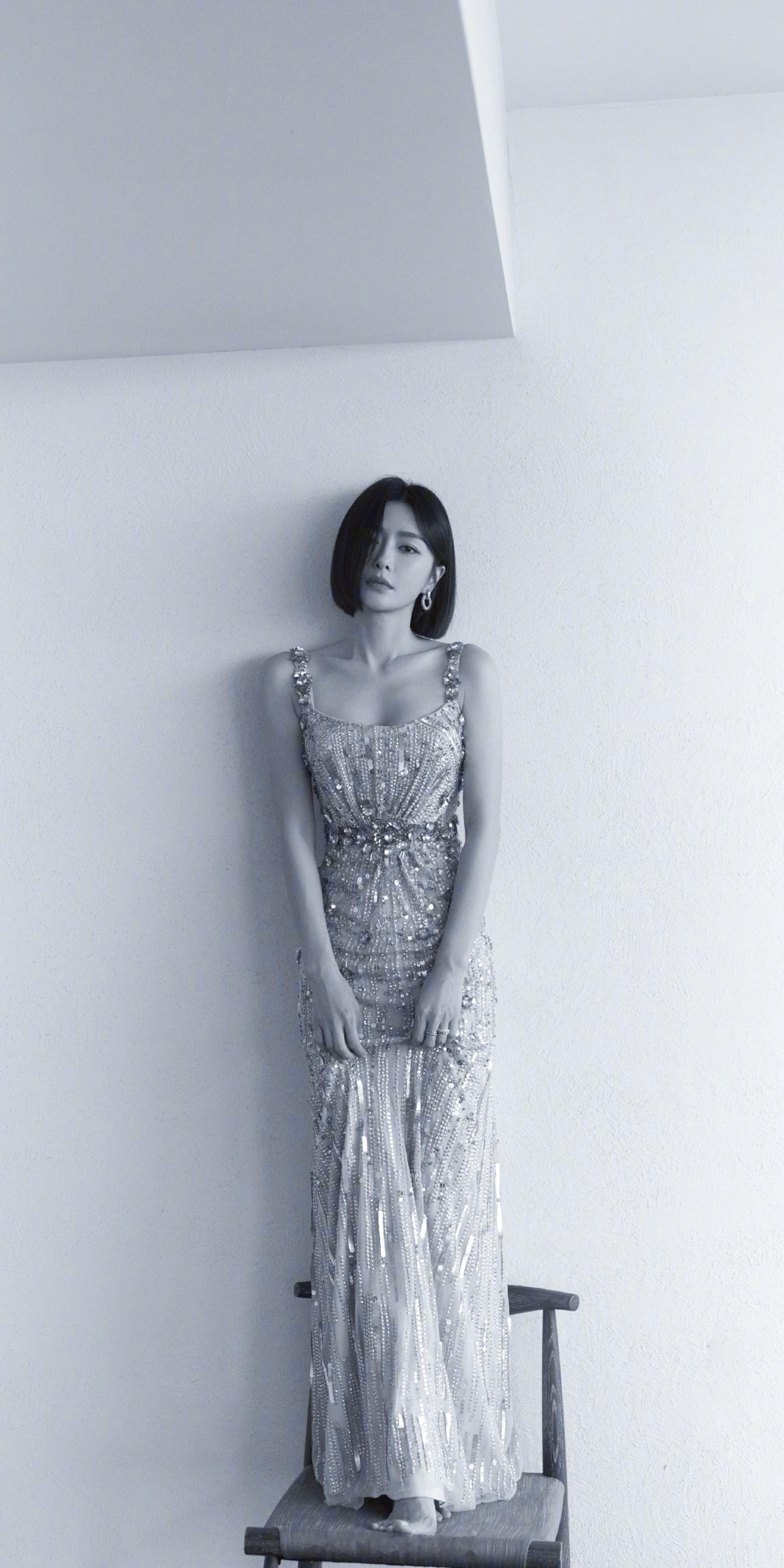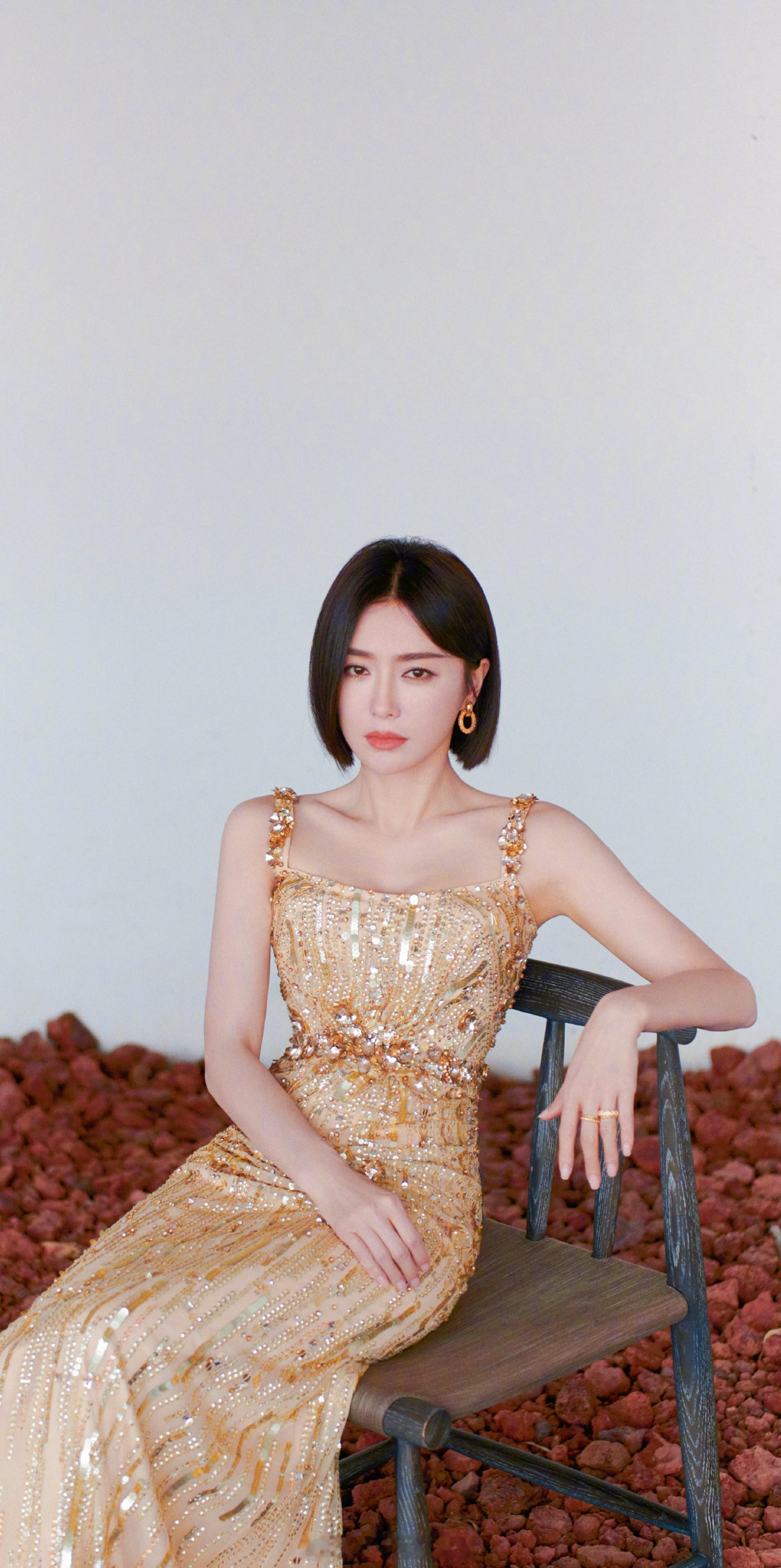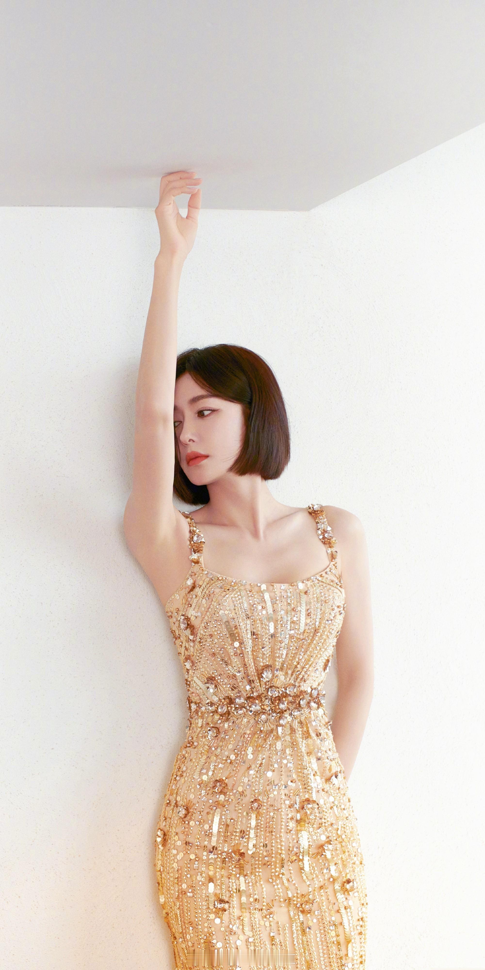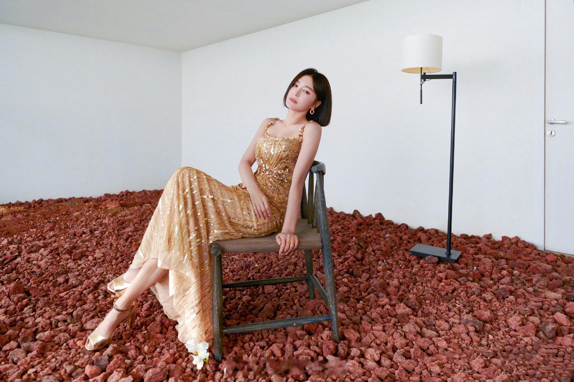 秦岚金色吊带长裙写真