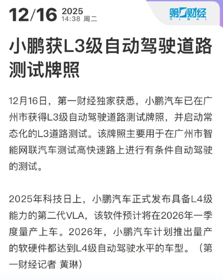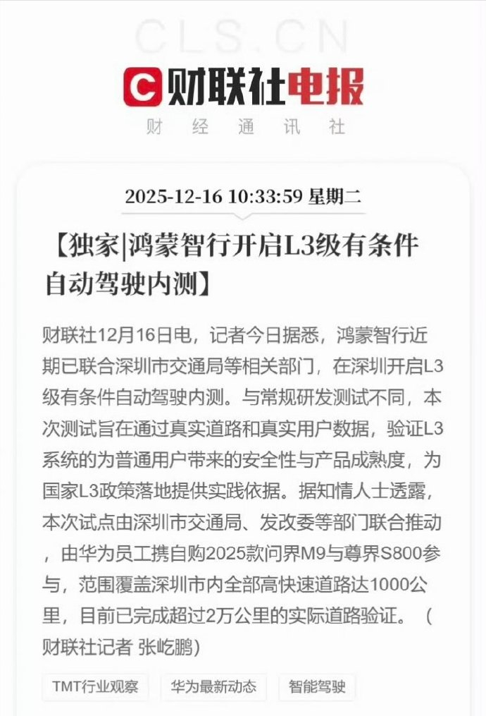 从早上到现在,关于L3 测试的消息不断。刚刚又加入了一家:理想也拿到了北京的L3 级自动驾驶道路测试牌照。不过目前鸿蒙智行的L3 内部测试消息相对具体、明细一些,已经用内部员工自购车型测试了超过 1000 公里。鸿蒙智行小鹏理想
