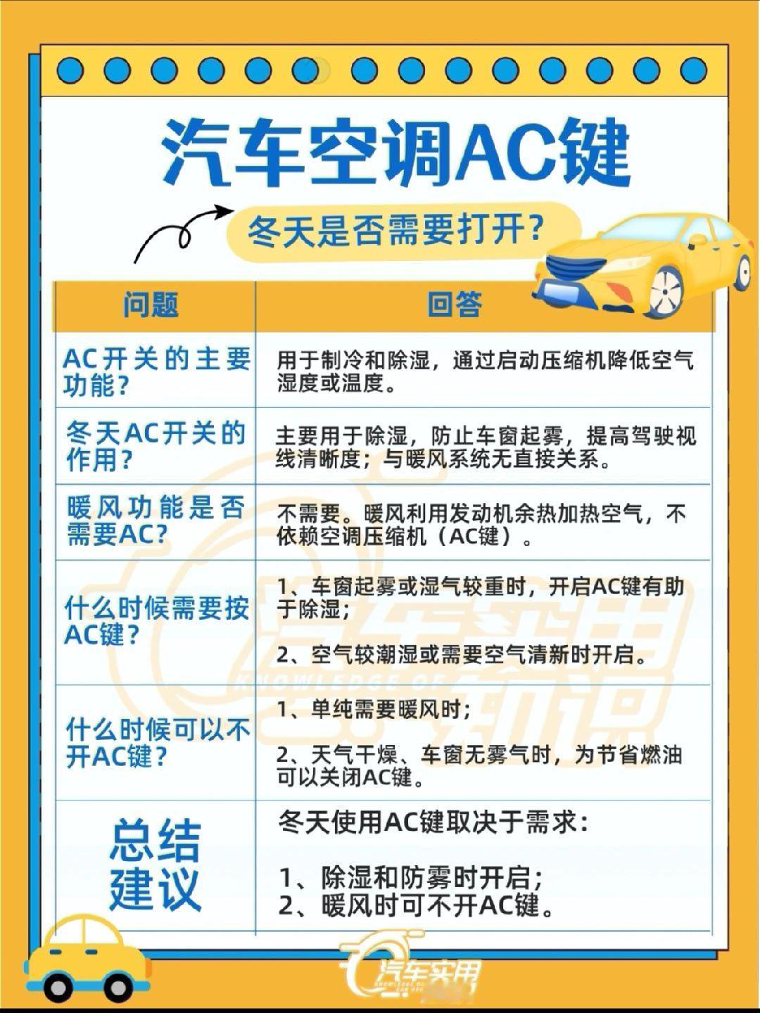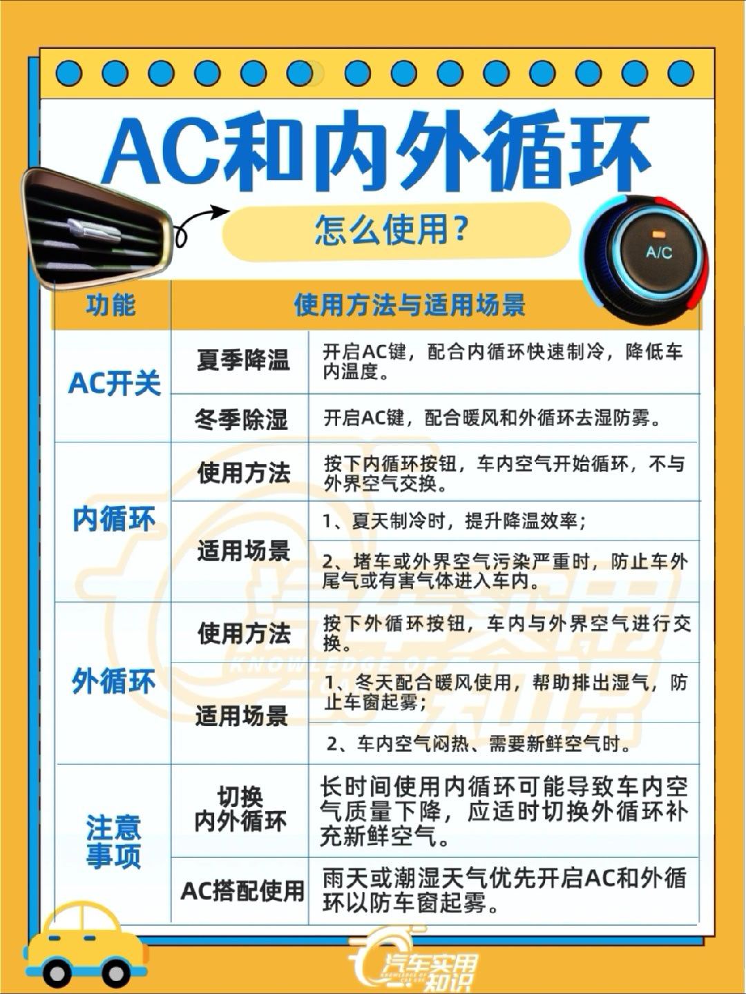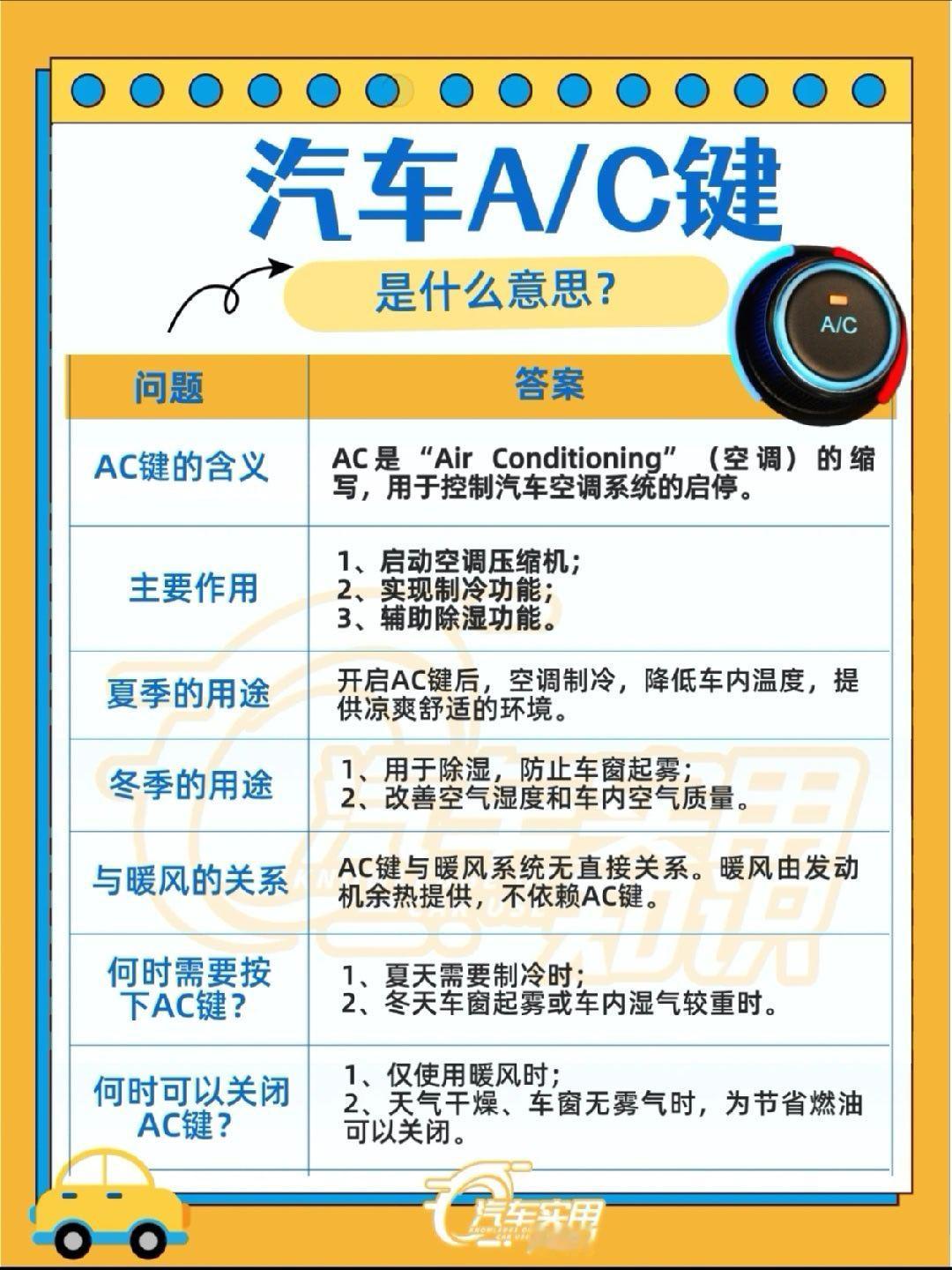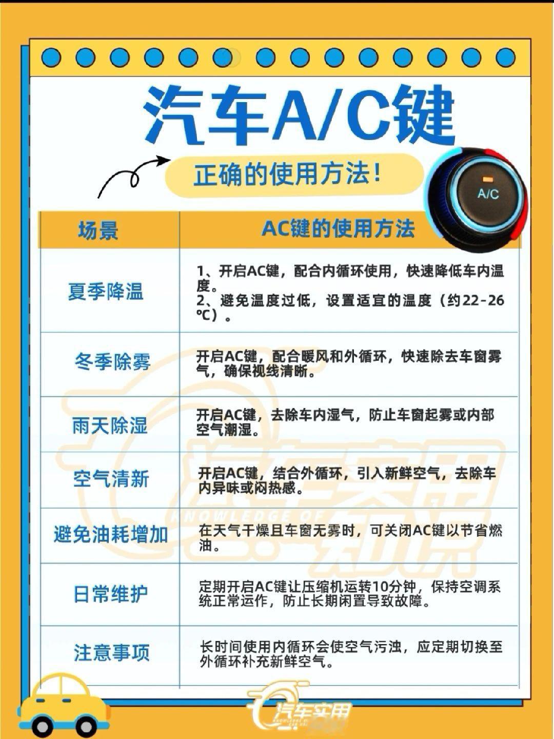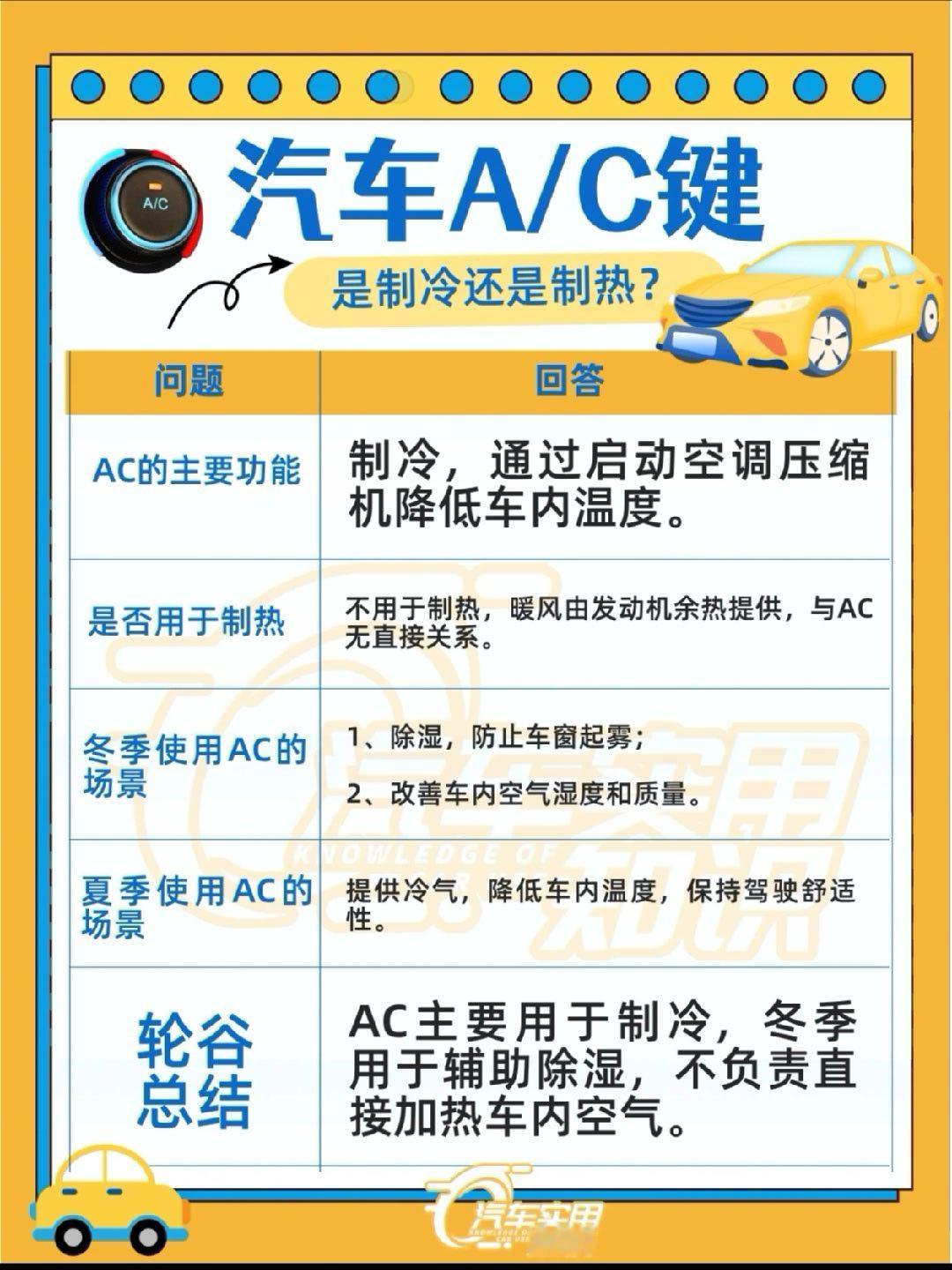很多车主不知道汽车上的AC键到底是干啥的,其实这个小按钮用对了,能让你的车内环境更舒适,还能提升行车安全!今天俺来跟大家简单科普一下~ 👇什么是AC开关? 🤔AC开关的两个核心功能 🚘👀AC开关和暖风有关吗? 🌡️🔥什么时候开AC?什么时候关? 🤓👇戳图了解详情哦👉🏻总结:AC开关不是用来加热的,它主要负责制冷和除湿。夏天让你凉快,冬天让你视线清晰,灵活使用才能让驾驶体验更棒! 🥰🚗赶紧看看你的车上AC键用对了吗?我与汽车的日常大v聊车