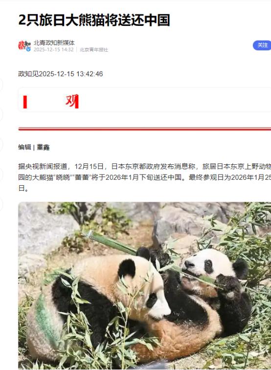 日本突然宣布了 12月15日,日本东京都政府发布消息称,旅居日本东京上野动物园的大熊猫晓晓蕾蕾将于2026年1月下旬送还中国,最终参观日为2026年1月25日。   这消息一出,可真是让不少日本民众心里空落落的。这对龙凤胎可是上野动物园的镇园之宝,自2021年6月出生以来,就凭着圆滚滚的萌态霸占日本社交平台热搜,成为实打实的顶流萌物。   它们是上野动物园首例龙凤胎大熊猫,妈妈是旅日大熊猫仙女,爸爸是比力,还是之前同样火遍日本的大熊猫香香的亲弟弟妹妹,打从出生就自带光环。   2022年1月首次公开亮相时,恰逢疫情防控关键期,园方只能采取抽签方式放票,每天仅限2000人入园,单张门票的中签率低至三百多分之一。   为了让这对小家伙适应人群,工作人员提前做了不少准备,甚至安排10名员工在展厅前故意指手画脚,慢慢训练它们做到置若罔闻。   即便参观时间被严格控制在一分钟左右,依旧有无数人甘愿熬夜排队参与抽签,就为了能亲眼看看这两个黑白团子。   熟悉它们的粉丝都知道,姐弟俩的性格反差特别大。哥哥晓晓更好动,对周围一切都充满好奇,总爱爬高上低嬉戏打闹;妹妹蕾蕾则偏高冷,常常我行我素,独自趴在角落啃竹子,这种反差萌让它们收获了不同喜好的粉丝。园方还专门为它们举办过两岁生日会,连中国驻东京旅游办事处都参与主办,足见其受欢迎程度。   更关键的是这对大熊猫可不是单纯的萌宠,简直是上野地区的“经济引擎”。有数据估算,它们每年能为周边带来超过300亿日元的经济效益,折合成人民币大概15亿元,周边七成商家的收入都靠它们带动。   从印着晓晓蕾蕾卡通形象的钥匙扣、玩偶,到定制款咖啡、点心,各类周边商品常年供不应求,不少游客专门从外地赶来,只为打卡熊猫主题店铺。   随着送还消息公布,日本民众的不舍情绪彻底爆发。短短一周内,民间发起的请愿挽留活动就征集到30多万个签名,大家纷纷留言诉说自己的牵挂。   上野动物园开启的“最后见面对象”抽选活动,更是吸引了200多万人争抢10万个名额,竞争激烈程度远超之前的任何一次活动。   让人揪心的是,晓晓蕾蕾回国后,日本将迎来中日邦交正常化以来第一次“零熊猫时代”。在此之前,和歌山冒险世界的4只大熊猫已经在2024年回国,当地盂兰盆节游客直接减少1万人次,酒店预订量暴跌20%,不少靠熊猫生意为生的商户愁眉不展。上野周边的商家更是提前开始打折甩货,地铁里原本常年悬挂的熊猫广告,也陆续换成了普通动物海报,气氛格外伤感。   其实日本官方也做过挽留努力,不仅计划投入5亿日元升级熊猫馆舍,还提出把每年的租借费用从50万美元翻倍到100万美元,但这些举措最终都没能改变结果。   核心原因还是在于当前中日两国政治互信受损,中国野生动物保护协会早已明确表态,大熊猫合作需以相互尊重和政治互信为基础,在关键问题没有改善的情况下,暂不研究续借事宜。   不少日本民众对此感到十分无奈,纷纷吐槽“政治家的错误,为何要让熊猫承担”。有网友留言说,熊猫不是简单的租借品,更像是住了53年的家人,是连接中日民众感情的桥梁。   还有人回忆起之前香香回国时的场景,当时超过6万人报名抽选最后参观名额,300多名粉丝专门赶往机场送别,对着搭载香香的飞机大喊“谢谢你”,如今这样的不舍场景又要重现。   距离1月25日的最终参观日越来越近,上野动物园里每天都挤满了前来告别的游客。大家拿着相机不停拍照,想把晓晓蕾蕾的样子留在镜头里,还有人特意带来手写的祝福卡片。   这对陪伴了日本民众四年多的大熊猫,用自己的萌态温暖了无数人的心,也成为了中日友好的见证。即便即将离别,这份跨越国界的喜爱,想必会一直留在大家心里。
