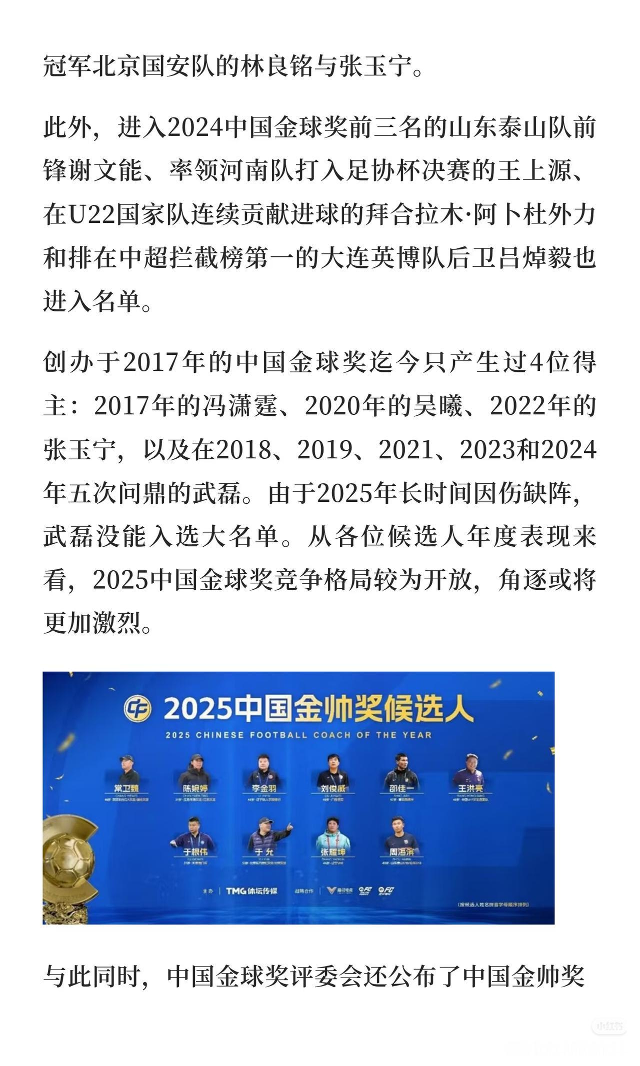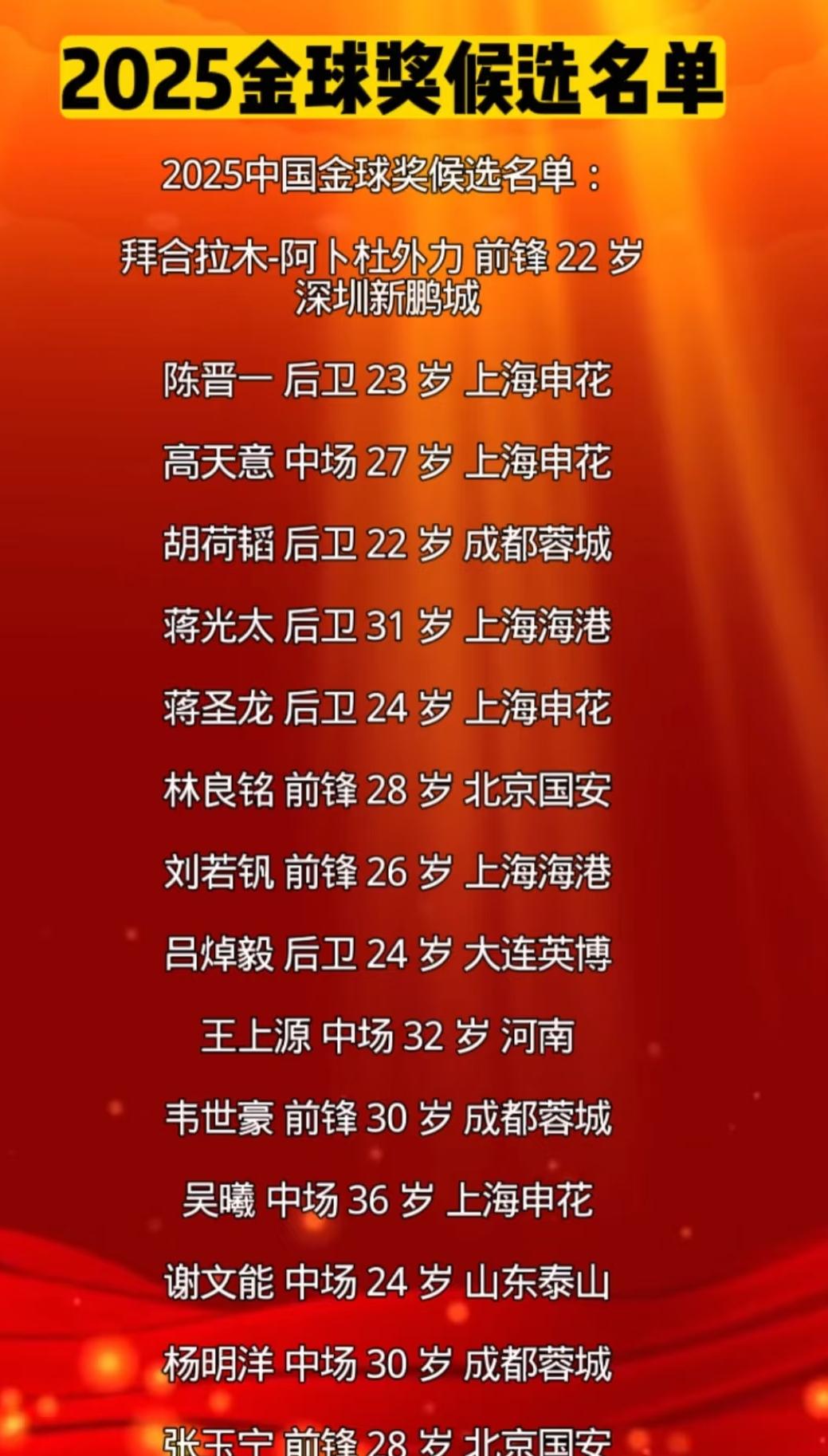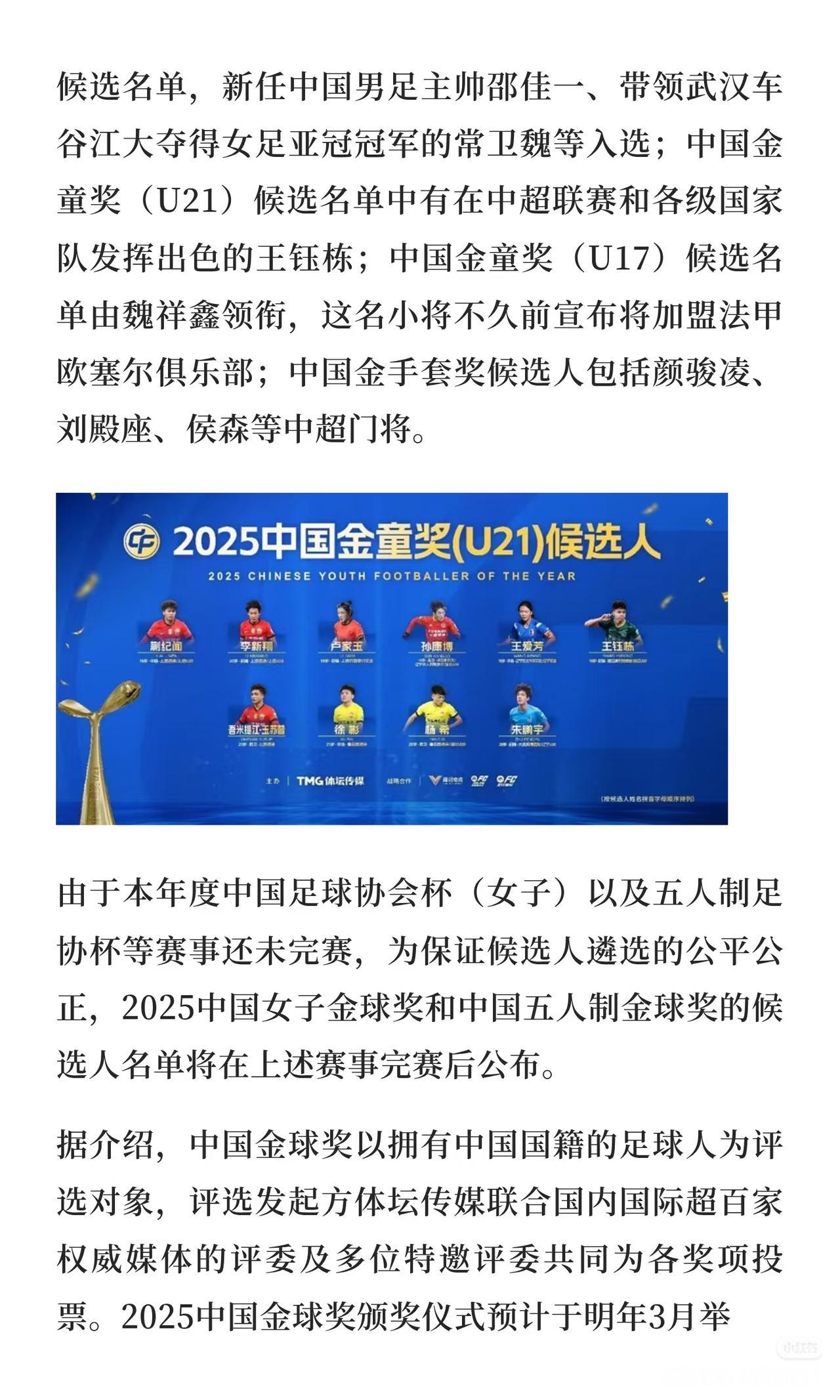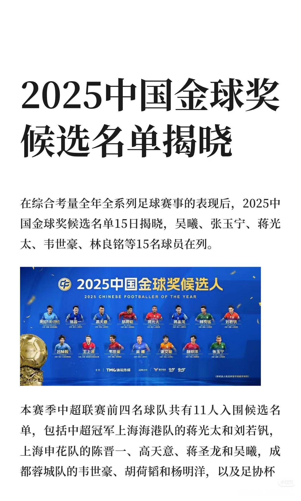 2025中国足球金球奖候选名单,让人大跌眼镜。 竟然没有本土最佳射手王钰栋,有网友认为,王钰栋岁数太小了,而且已经入选U21金童奖候选名单。 这不是球盲看法吗?按这说法,罗纳尔多18-9岁就不该拿世界足球先生了?今年的亚马尔也不该进入金球奖候选了? 当然,王钰栋即便入选也未必最后能当选足球先生,但你不能剥夺他的资格啊! 更何况,这一堆人,感觉就是菜鸡互啄,谁也不比谁高多少,给王钰栋也正常。