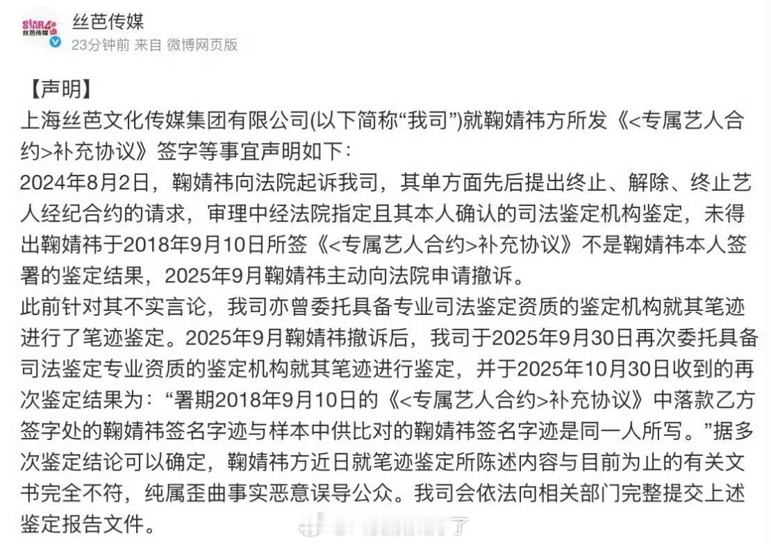 丝芭传媒发声明否认了伪造鞠婧祎签名一事,所以到底是什么情况?