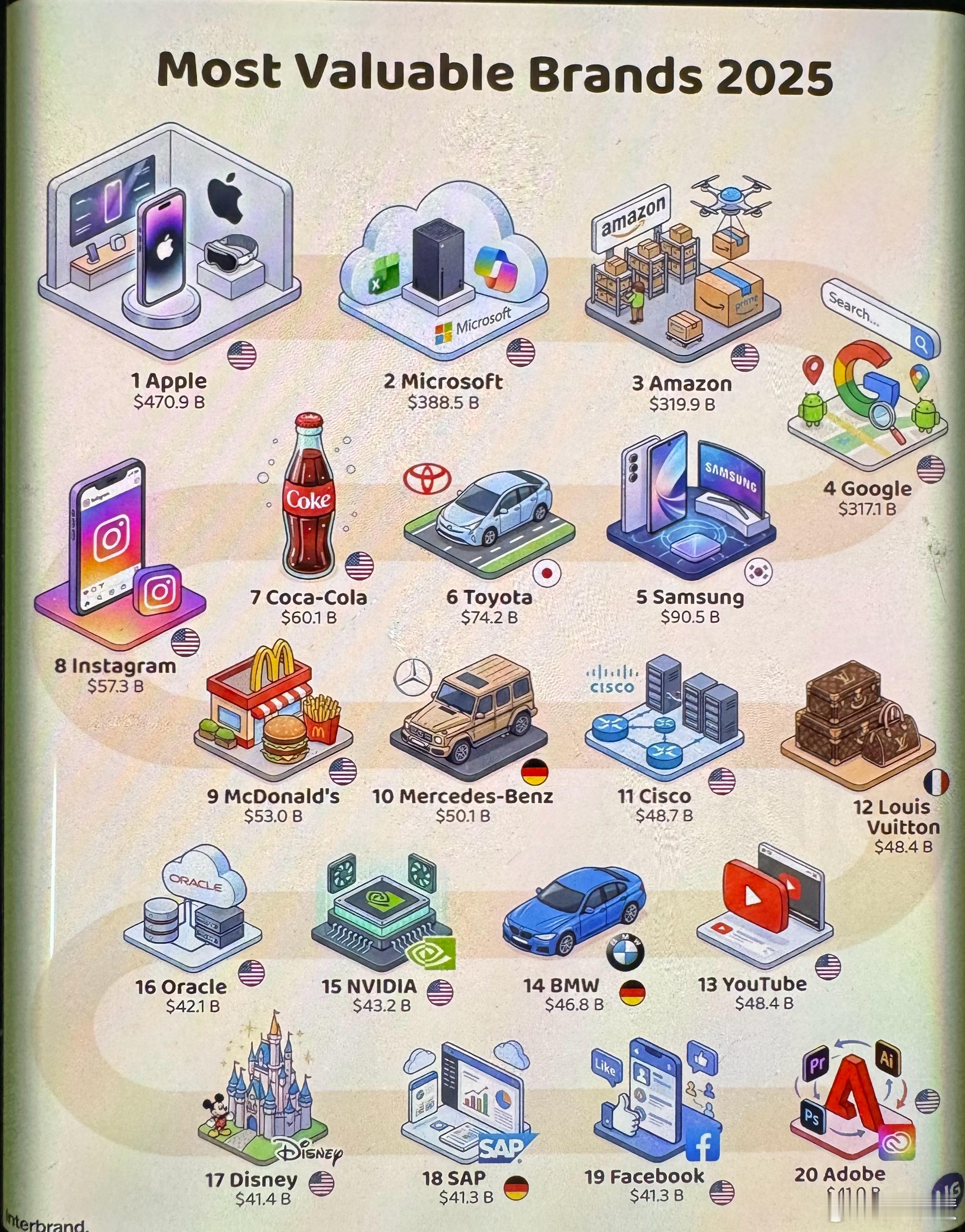 2025年最具价值品牌榜单:1. 苹果(Apple)——4709亿美元2. 微软(Microsoft)——3885亿美元3. 亚马逊(Amazon)——3199亿美元4. 谷歌(Google)——3171亿美元5. 三星(Samsung)——905亿美元6. 丰田(Toyota)——742亿美元7. 可口可乐(Coca-Cola)——601亿美元8. Instagram——573亿美元9. 麦当劳(McDonald’s)——530亿美元10. 梅赛德斯-奔驰(Mercedes-Benz)——501亿美元11. 思科(Cisco)——487亿美元12. 路易威登(Louis Vuitton)——484亿美元13. 优兔(YouTube)——484亿美元14. 宝马(BMW)——468亿美元15. 英伟达(NVIDIA)——432亿美元16. 甲骨文(Oracle)——421亿美元17. 迪士尼(Disney)——414亿美元18. 思爱普(SAP)——413亿美元19. 脸书(Facebook)——413亿美元20. 奥多比(Adobe)——410亿美元数据来源:Interbrand(英特品牌集团)