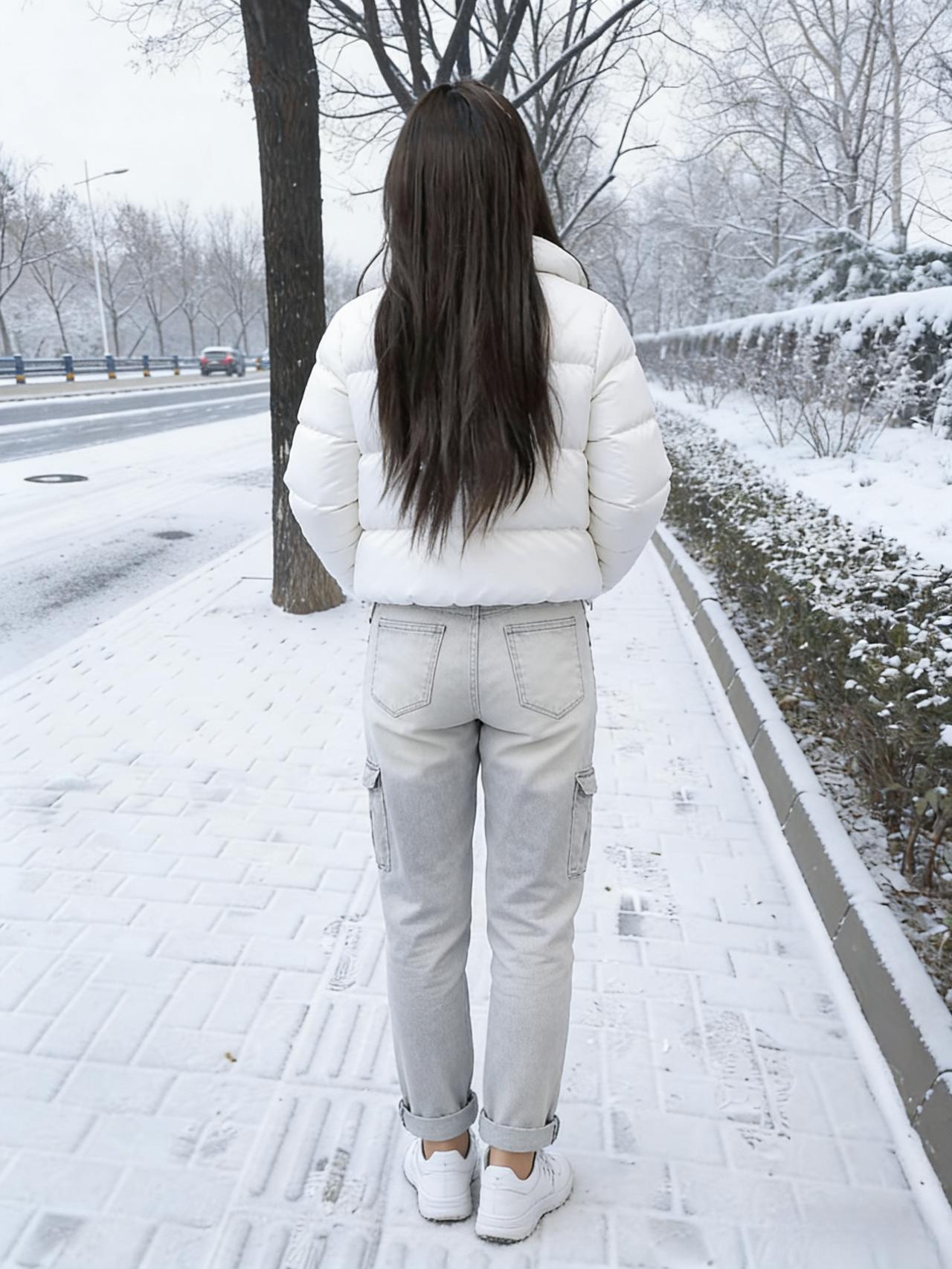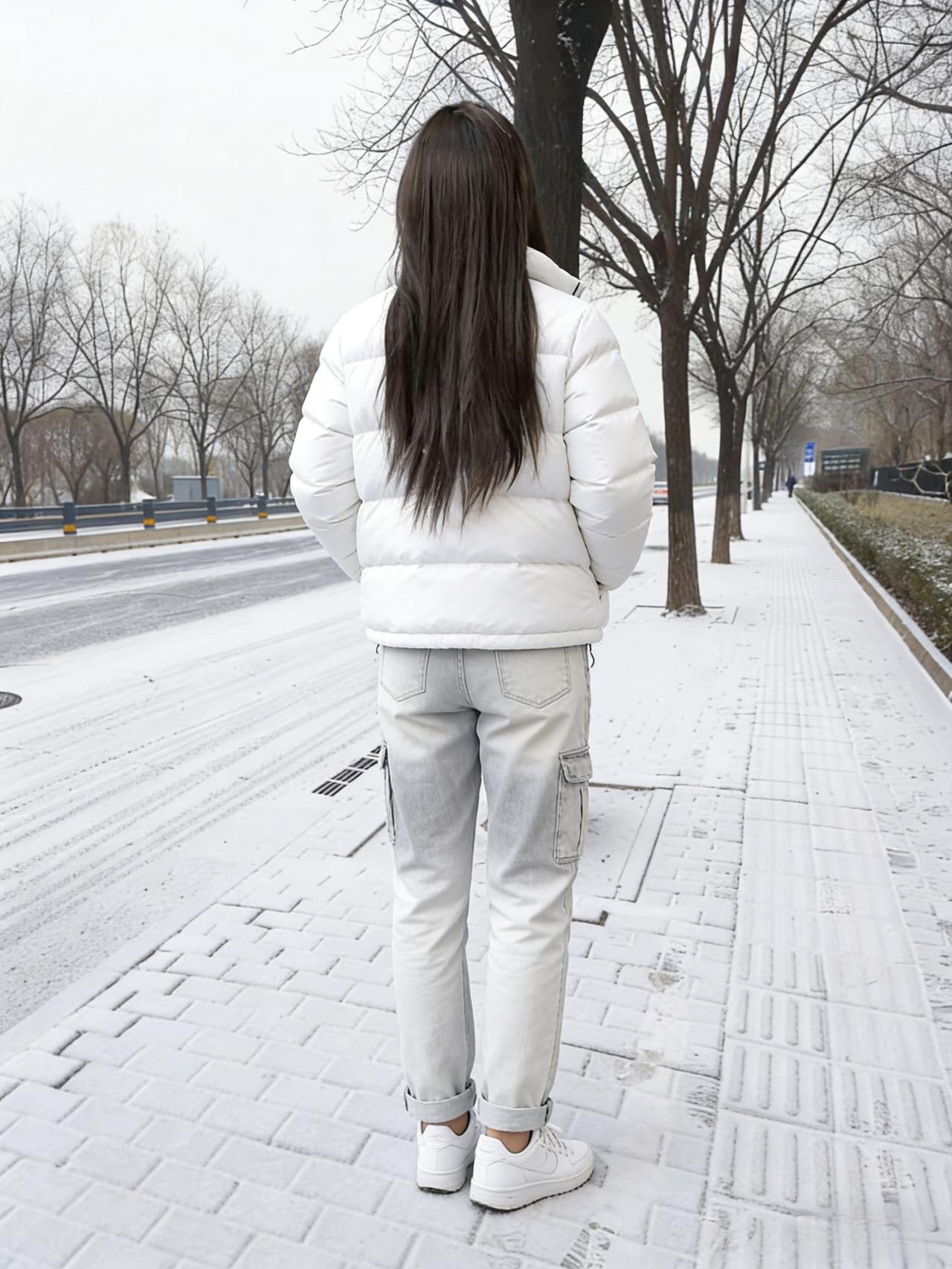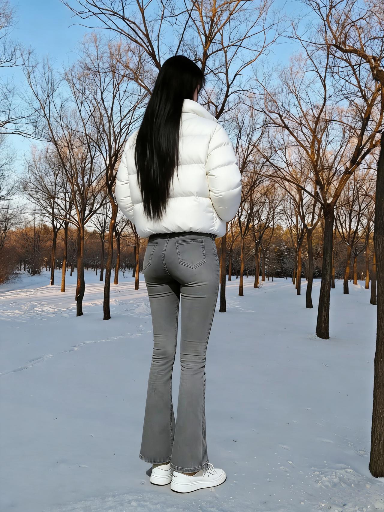 雪把世界洗成单色 她的背影是这画布上的立体注脚 白羽绒服裹着柔软的铠甲 牛仔裤贴着腿型,藏着随性的倔强 长发如瀑,垂落的是未被驯服的温柔 ~ 树影疏疏,筛下细碎的天光 脚步停驻,与雪地交换沉默 不必说话,雪会听懂心跳的节奏 孤独是透明的壳 裹着一颗在冬日里依旧温热的心 转身吗?不,此刻的背影 已是与自我和解的模样