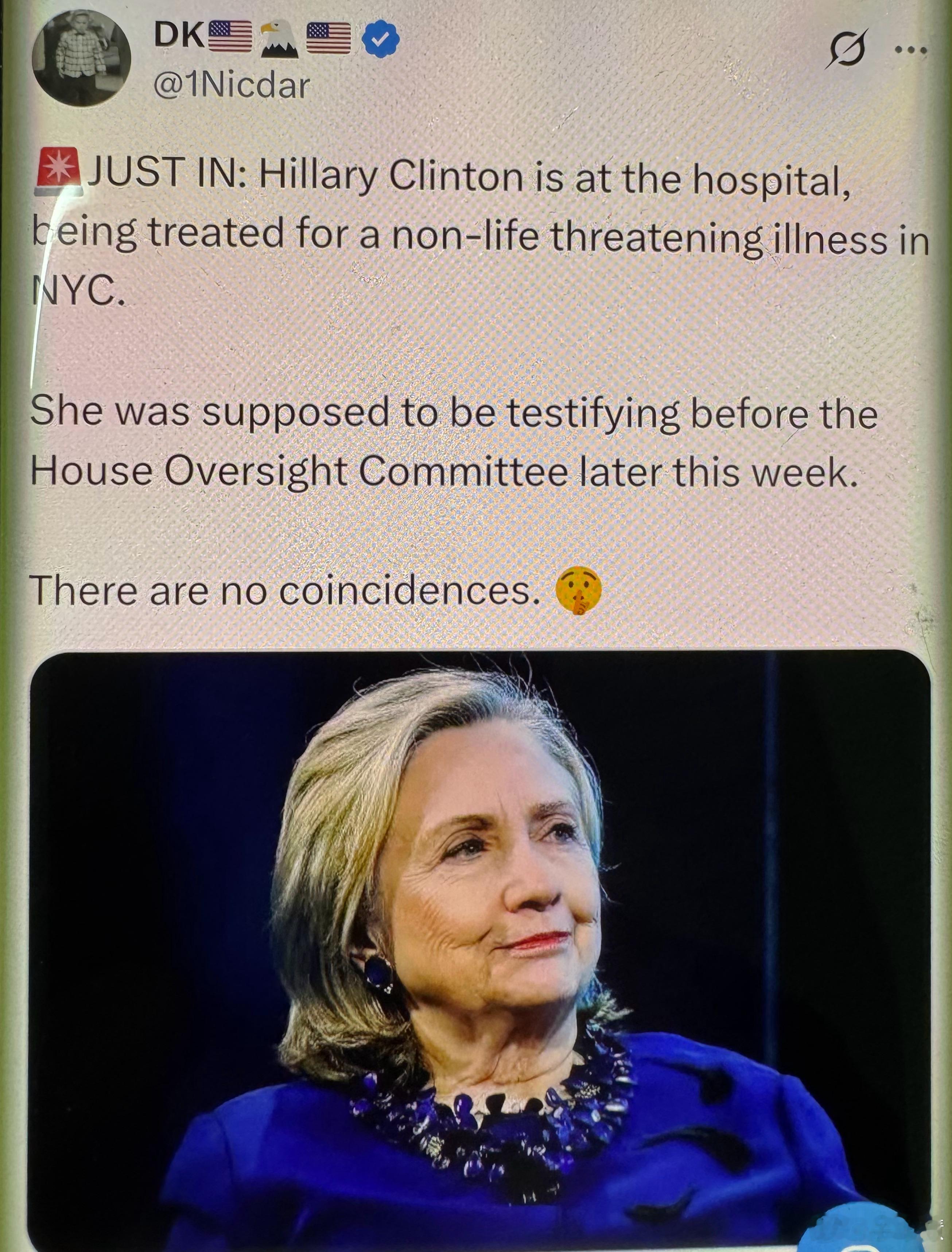 突发:希拉里·克林顿现身纽约医院,因非危及生命疾病接受治疗希拉里·克林顿目前正在纽约一家医院,因患非危及生命的疾病接受治疗。原本,她计划于本周晚些时候在众议院监督委员会(House Oversight Committee)出庭作证。世间从无巧合。