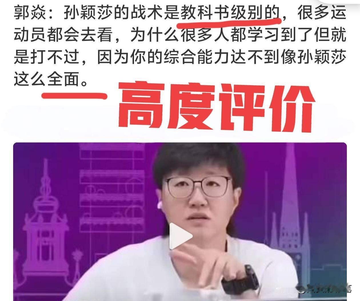 郭焱对孙颖莎的评价非常高,一起进来听听[呲牙] 听,她毫不吝啬地用了“教科书般”和“全面”两个词汇,对莎莎的能力给予了高度肯定。她甚至用“止疼片”来称赞莎莎对战伊藤美诚,具备绝对的统治力。 的确,孙颖莎的技术打法已到了炉火纯青的地步,别人一直都在模仿她,也一直从未超越她。孙颖莎 孙颖莎笑容 孙颖莎名场面 孙颖莎情商 孙颖莎语录 孙颖莎演技 孙颖莎十佳球