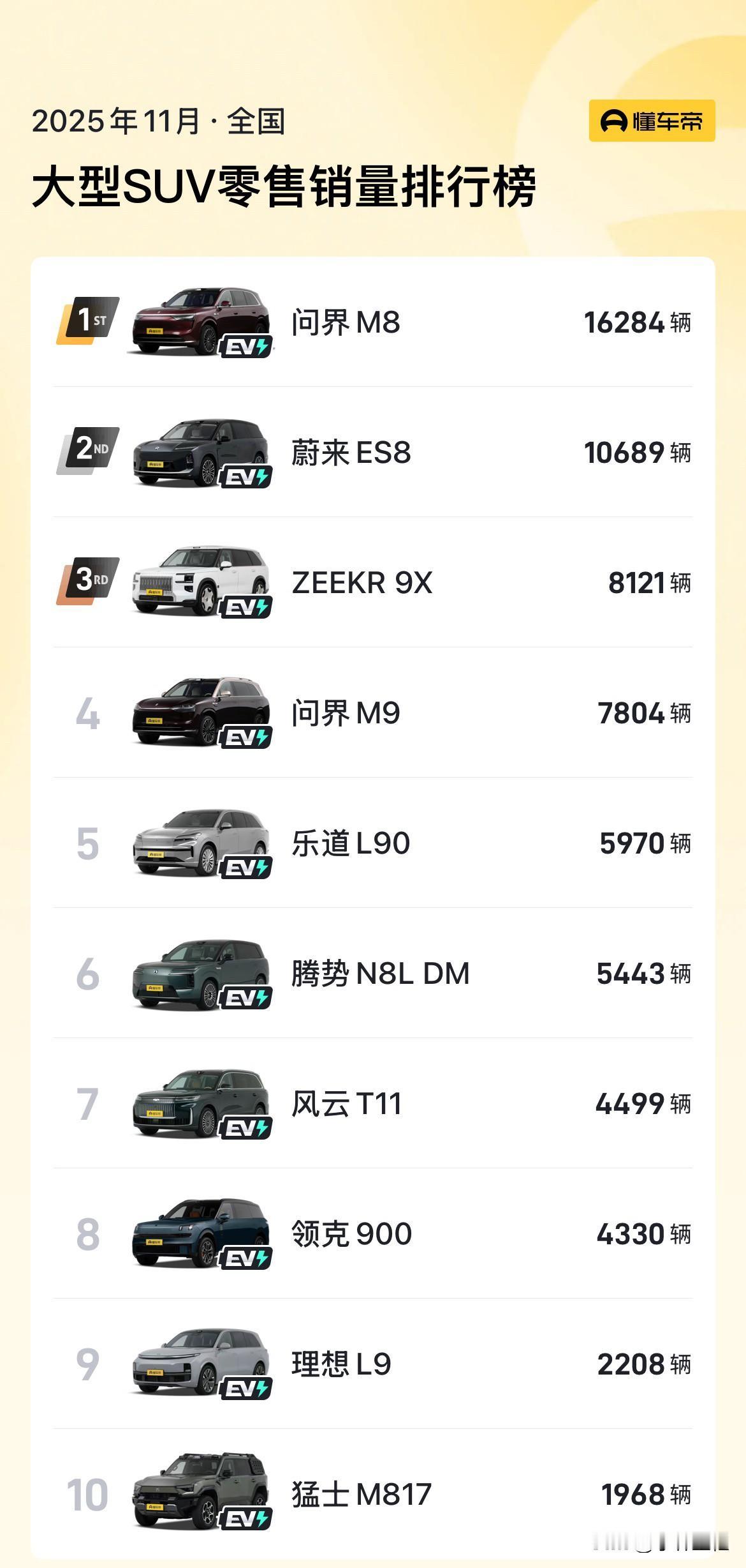 说实话,虽然吉利在新能源技术方面一直在追随,但是在中高端车型的发展,绝对要比比亚迪成功得多! 看看两家20万以上车型销量,极氪9X、极氪7X、领克900的销量,再看看腾势N9、腾势N8L、方程豹豹5、方程豹豹8的销量,吉利是不是比比亚迪要好那么一点?[呲牙]