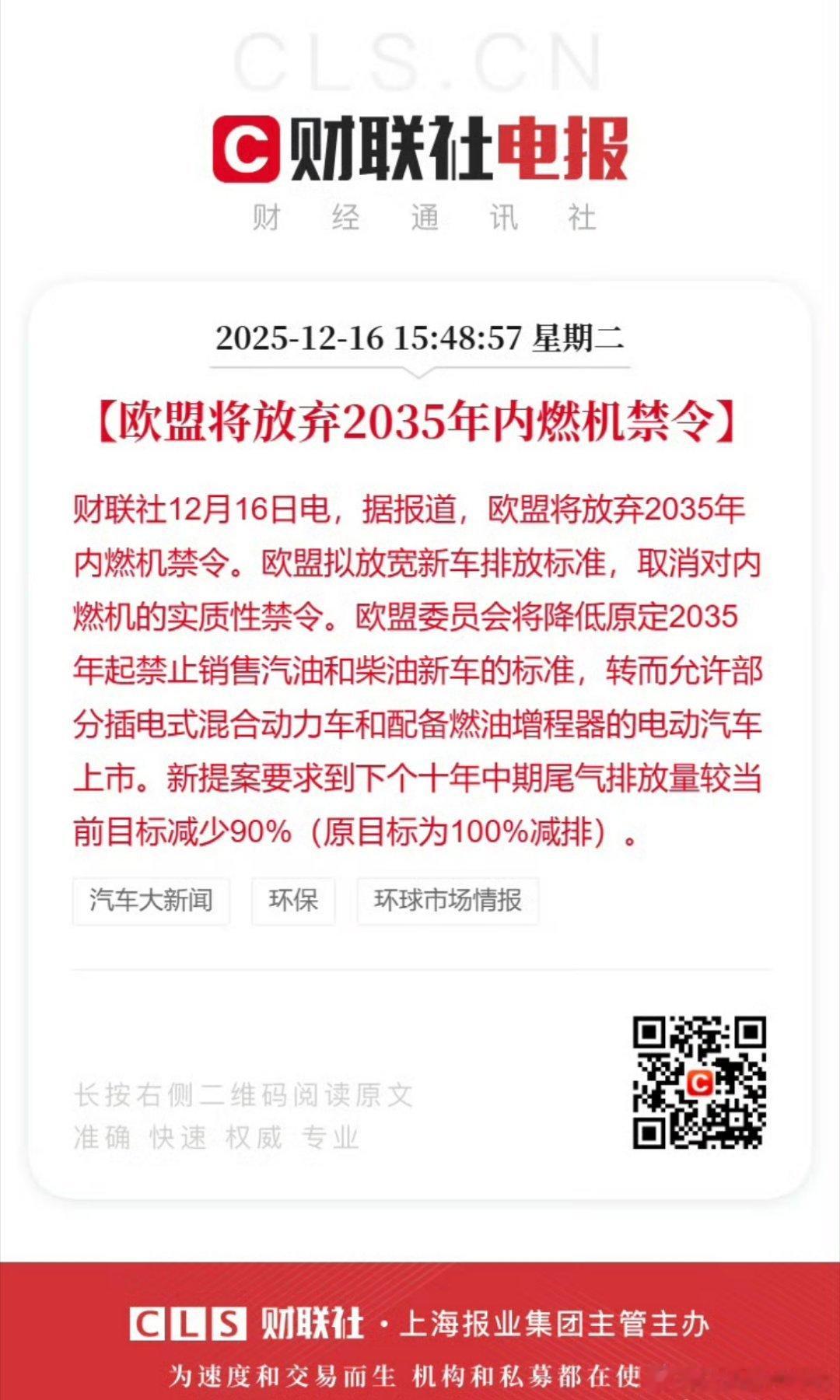 欧盟将放弃2035年内燃机禁令当初吹的牛有多离谱,现在的巴掌就有多清脆。从BBA相继宣布继续开发燃油车开始重启燃油车开发,这个打脸就开始啦。【奥迪】2025年6月其CEO高德诺宣布撤回2033年停售内燃机车型的计划,还会在2024 - 2026年推出全新内燃机和插电式混合动力车系列,后续不再设定燃油车相关终止时间表。【奔驰】放弃了2030年在主要市场全面转向电动化的目标,计划2027年推出全新内燃机车型阵容,并延续生产至21世纪30年代,未来十年也会持续改进和更新燃油车产品。【宝马】始终秉持“多元动力共存”的技术开放战略,没设定燃油车退出时间表,还明确会继续投资内燃机和混合动力技术,此前还有消息称其计划重启增程系统的研发与应用。