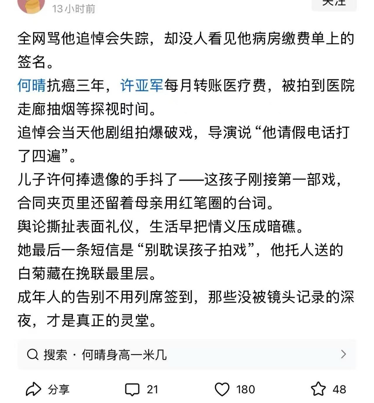 不明白现在有的自媒体是怎么了,为了流 量 罔 顾 事 实 制 造 话 题,许亚军和何晴2003年就和平分手了,但是据知情人爆料何晴这十年抗 癌之路都是许亚军出钱出力, 这两年还给何晴做那个干 细 胞 延 长 生 命,要不然都延 续不了十年,因为之前下过好像六 七 次 病 危 通 知 书了。讲真,亲人都很难做到一个前夫做的这么多吧?逝者已矣,大家都很悲痛,无 良 媒 体不要拿这种事博眼球了