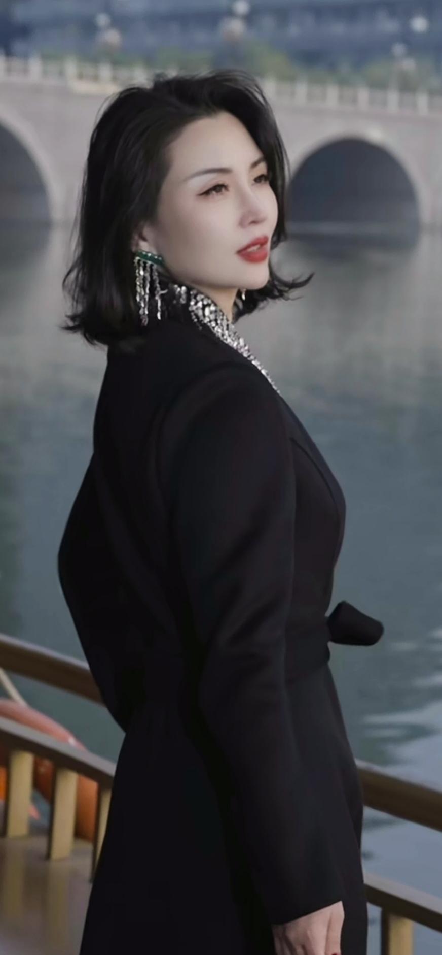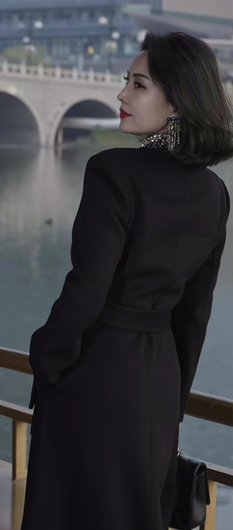 优雅黑衣配闪亮项链,都市女性魅力瞬间。
