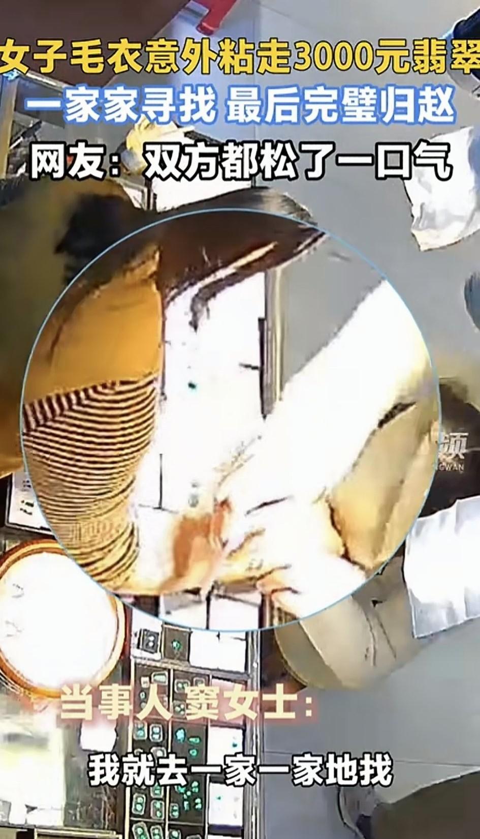 广东揭阳,一女子去逛玉器市场购物,期间女子走进第一家店铺查看玉配饰时,无意间将一对翡翠耳环粘在了她的毛衣上。不少人可能以为,这种意外情况,女子大有可能会占为己有,但女子发现衣服上的翡翠耳环后,立即拿着耳环一家家的寻找失主,最终成功将耳环还给了第一家店铺。 据悉,12月12日,女子在玉器市场购物时,在第一家档口查看商品时,一对翡翠耳环无意间粘在了她的毛衣上。起初女子也没回发现,大约一小时后,女子在另一家店铺买东西时,才被店员发现她衣物上沾的翡翠耳环。 店员经过仔细确认后,确定这耳环不是该店的商品。急别人所急,于是女子赶紧拿着耳环主动挨家询问,最终确认是第一家店铺的翡翠耳环,她才长长的松了口气,完好的将耳环还给了店主。 失而复得的店主也是如释重负,因为这个小小的耳环价值三千多,这要真不在了损失可不小,而且监控也没能清楚拍下耳环丢失的过程,这要是去找,还真不一定找得到。所以女子主动归还的行为,让店主发自内心的点赞和敬佩! 不得不说,女子这主动归还的行为实属难得,这不但展现了她拾金不昧的精神,也说明了她诚信的高尚品德,更是为社会传递了一波正能量,就这份道德素养不但值得点赞,更是值得大家学习!而老板事后,更应该好好的感谢一下她。