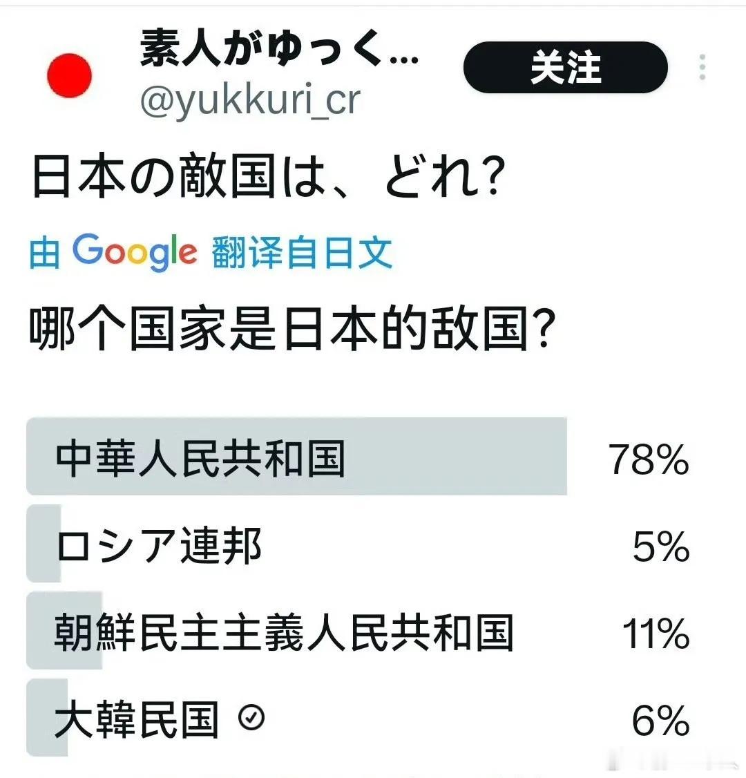 日本网民自己投出:中国是日本最大敌人!这提醒几个信号,日本这个国家很不健康。第一,日本人不自量力,民族思维跟着美国人控制的舆论平台走,把中国视为最大敌人,所以高市早苗介入台海谬论会得到支持。第二,日本人的军国主义势力没有得到清算。过去一百多年,只有日本伤害中国,中国没有伤害日本。日本人没有基本认知。第三,我们得满足日本人要求。把战败国日本的领土限制在开罗宣言和波斯坦公告规定的地方去。把琉球群岛要回来。