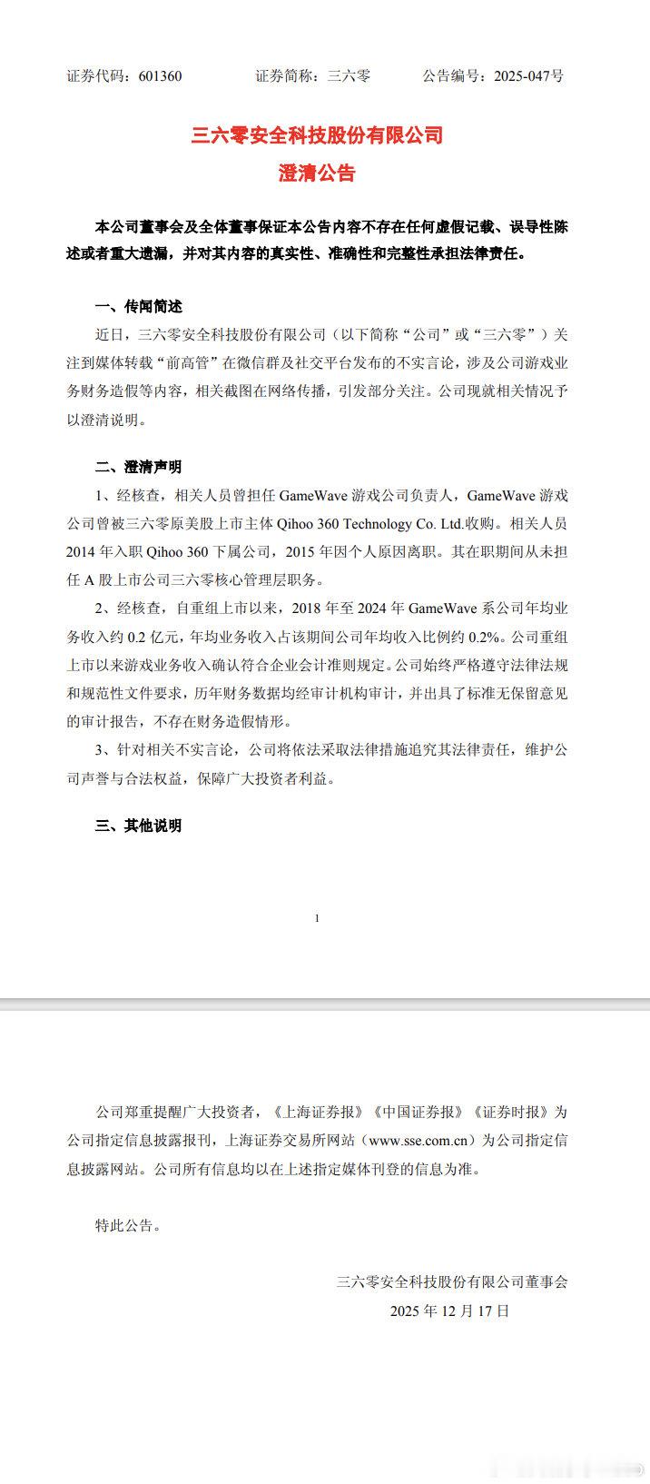 【360公告360澄清公告】12月16日,三六零(601360.SH)发布澄清公告称:公司注到媒体转载“前高管”在微信群及社交平台发布的不实言论,涉及公司游戏业务财务造假等内容,相关截图在网络传播,引发部分关注。相关人员曾担任GameWave游戏公司负责人,GameWave游戏公司曾被三六零原美股上市主体Qihoo 360 Technology Co.Ltd.收购。相关人员2014年入职Qihoo 360下属公司,2015年因个人原因离职。其在职期间从未担任A股上市公司三六零核心管理层职务。经核查,自重组上市以来,2018年至2024年GameWave系公司年均业务收入约0.2亿元,年均业务收入占该期间公司年均收入比例约0.2%。公司重组上市以来游戏业务收入确认符合企业会计准则规定。公司始终严格遵守法律法规和规范性文件要求,历年财务数据均经审计机构审计,并出具了标准无保留意见的审计报告,不存在财务造假情形。360称游戏业务收入符合会计准则规定