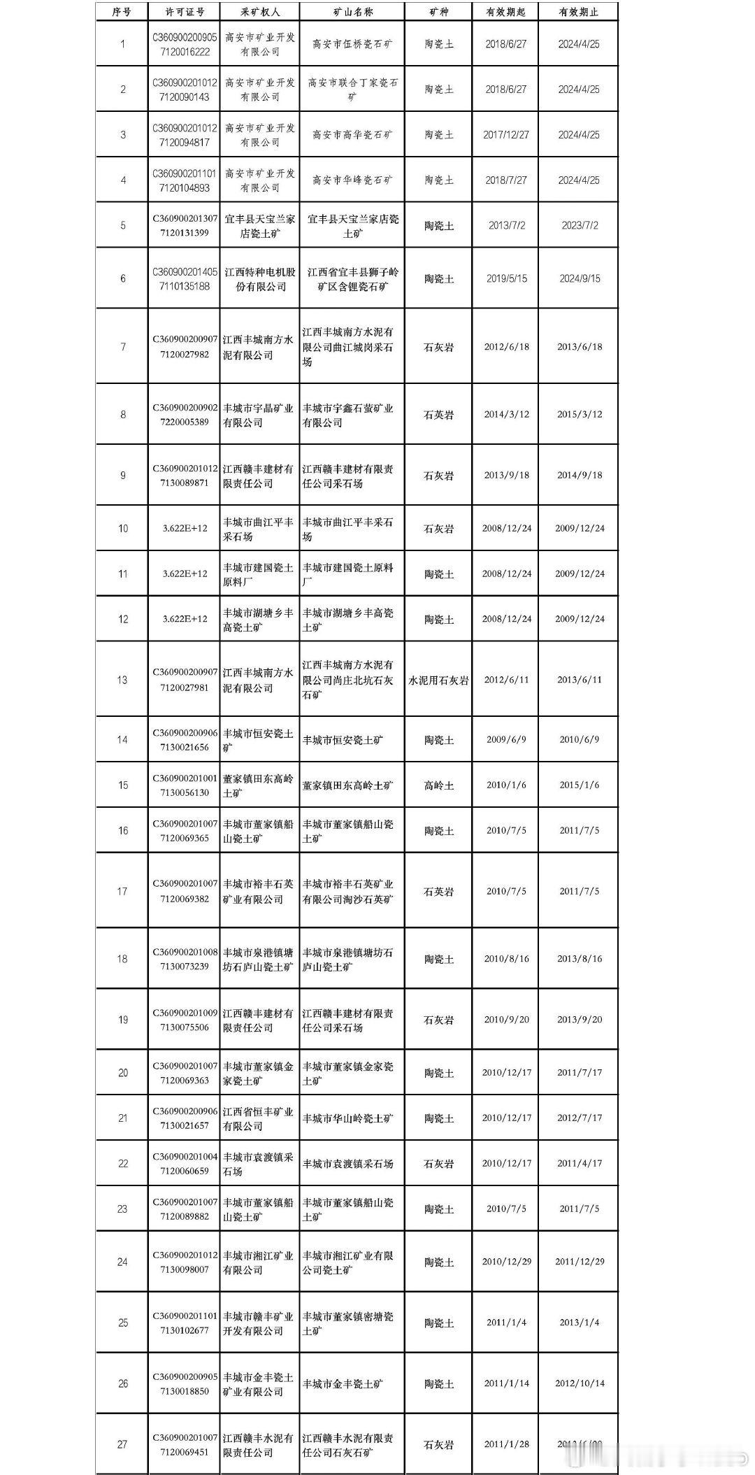 【亚洲锂都宜春拟注销27个采矿权】继宁德时代枧下窝矿被关停后,“亚洲锂都”宜春又现大动作。近日,碳酸锂期货价格大涨,主力合约再次站上10万元关口。最新消息,根据《矿产资源法》、《矿产资源开采登记管理办法》和《自然资源部关于进一步完善矿产资源勘查开采登记管理的通知》等相关要求,宜春市自然资源局拟对高安市伍桥瓷石矿等27宗采矿许可证予以注销。目前,宜春市自然资源局已对拟注销的27宗采矿许可证进行公示,公示期(30个工作日)满后予以公告注销。注销后,生态修复等相关义务由原矿权人履行。记者注意到,此次拟注销的27宗采矿许可证,有效日期截止时点差别较大。其中,5宗采矿权许可证有效日期在2024年已到期,1宗采矿权有效日期为2023年到期,18宗采矿权许可证有效期在2010—2019年之间已经到期。另外,还有3宗采矿权许可证的有效期,在2010年以前就已经到期。从公示名单来看,高安市矿业开发有限公司涉及的量最多,此次拟注销4个采矿许可证。这4宗采矿许可证有效日期,均为2024年4月25日到期。高安市矿业开发有限公司成立于2013年,位于江西省宜春市,是一家以从事制造业为主的企业。企业注册资本600万元,实缴资本600万元。穿透股权,高安市矿业开发有限公司系宜春市矿业有限公司全资子公司,实控人为宜春市国资委。官网显示,宜春市矿业有限公司于2013年元月8日挂牌成立,是宜春市人民政府整合收储全市范围内的锂矿资源而专门组建的直属市政府的国有独资公司。公司按照“统一政策、统一管理、统一开发、统一经营”原则,收储经营管理开发锂矿资源,以确保全市锂电产业长期有效的锂资源供应保障。从上述27宗采矿许可证的矿种来看,17宗矿种为陶瓷土矿,7宗为石灰岩,其他矿种包括高岭土、石英岩。这些不同的矿种矿山,其中就包括了投资者关注度较高的锂矿矿山。譬如,江西特种电机股份有限公司旗下江西省宜丰县狮子岭矿区含锂瓷石矿,矿种为“陶瓷土”,该矿山采矿权许可证有效期为2019年5月15日—2024年9月15日。江特电机2023年年报显示,该公司目前拥有3个采矿权,分别为江西省宜丰县狮子岭矿区含锂瓷石矿、宜春市新坊钽铌有限公司钽铌矿和奉新县南方矿业有限公司白水瓷石矿,其中狮子岭矿石量1123.98万吨,Li2O资源量57322.98吨。江西宜春,全国四大锂矿重地,拥有亚洲储量最大的锂云母矿,被誉为“亚洲锂都”。但是,宜春的锂企(茜坑矿除外)开采许可证的矿种,几乎全部为“瓷土矿”、“高岭土”等矿种。比如说,今年8月10日,宁德时代旗下宜丰县圳口里—奉新县枧下窝矿区(简称“枧下窝矿区”)被关停,该矿山有效日期为2022年8月9日-2025年8月9日。矿种为“陶瓷土矿”。此次宜春自然资源局拟对27宗采矿许可证予以注销,其中有多少宗矿山、涉及多少锂企,目前暂不得而知。(e公司)