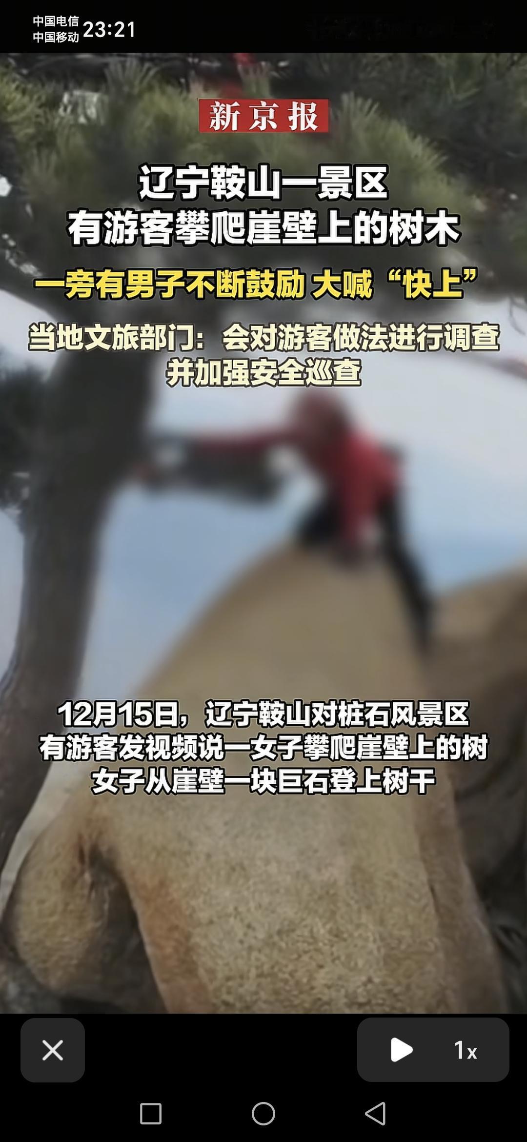 辽宁鞍山一山海景区一位游客在巨石上方攀爬岩壁上的树木,游客登上巨石之后一脚就踩上了树木,旁边还有衣服,旁边还有人不断的鼓励,“快爬”,景区说会对游客进行调查并且会在平时多加巡查。有网友提出,假如爬树的游客出现了意外,在旁边不断喊加油的人也会因此而要担责。