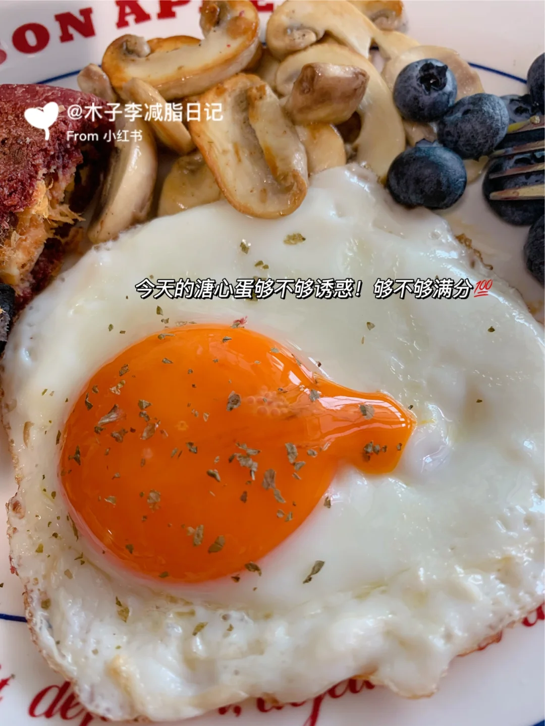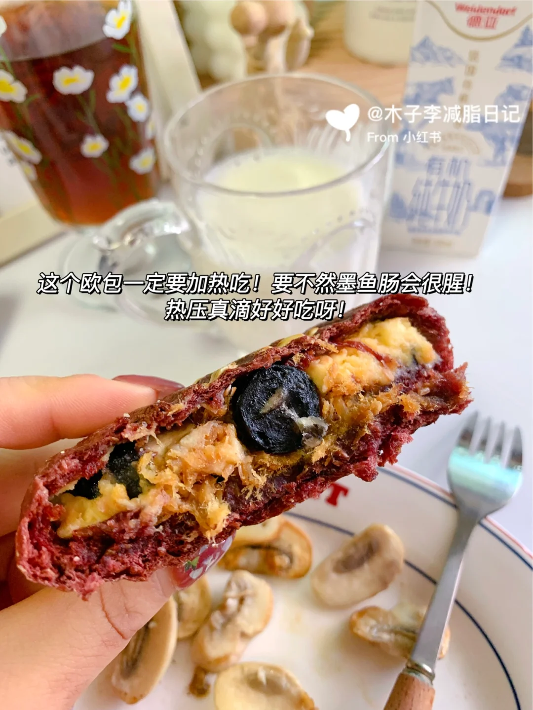 🍳早餐:纯牛奶➕普洱茶➕热压欧包➕煎蛋➕口蘑➕蓝莓