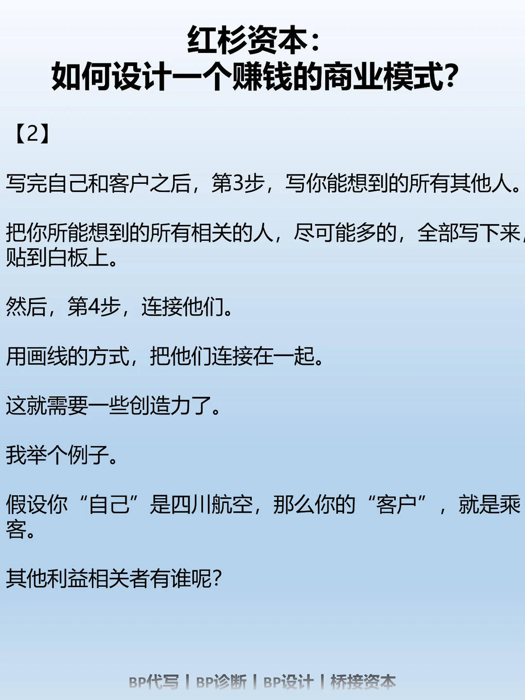 1)自己;2)客户;3)能想到的所有其他人;4)连接他们;5)去掉、增加或挪动利益相关者;6)整体有增量。