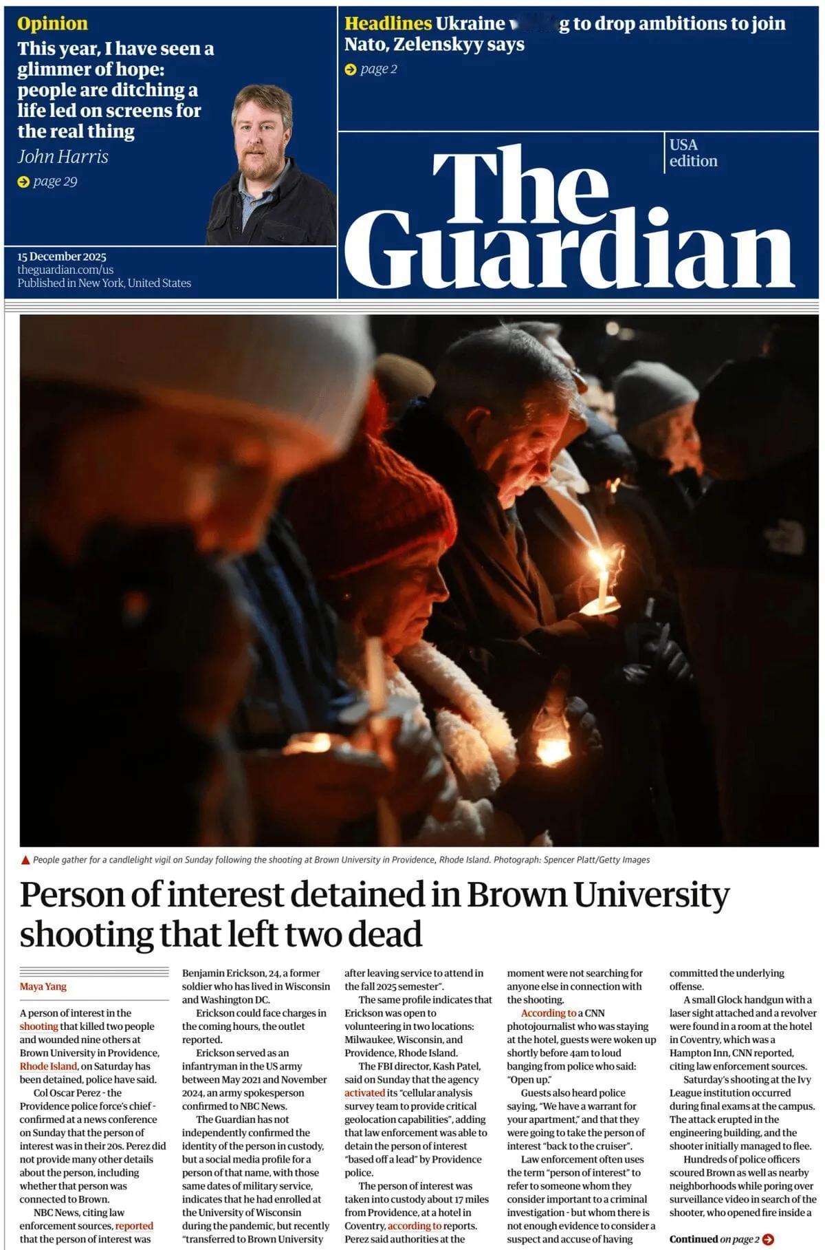 《卫报》头版报道称,美国罗德岛州普罗维登斯市布朗大学发生枪击事件后,人们于周日聚集举行烛光守夜活动。 布朗大学枪击案嫌犯被拘留,该事件造成两人死亡。 2025年12月13日下午,美国布朗大学校园内发生一起枪击事件,造成至少2人死亡、9人受伤。 事件发生在巴鲁斯-霍利大楼附近,该建筑是工程学院和物理系所在地,当时大楼内正在进行期末考试。 枪击发生时,校园发布了紧急警报并实施封锁,要求师生就地避险。 当局最初报告有2人死亡、8人受伤,随后确认第9名伤者为被枪击碎片击中,伤势不危及生命。 受伤者中多数为学生,2名遇难者身份已确认:一名是来自亚拉巴马州的二年级学生艾拉·库克,另一名是乌兹别克斯坦籍学生、立志成为神经外科医生的穆哈马德·阿齐兹·乌穆尔佐科夫。 嫌疑人是一名约30岁的男性,身穿黑色衣物,可能戴有面具,目前仍在逃。 警方在案发现场找到弹壳,并公布了嫌疑人视频试图征集线索。 调查过程中,警方曾拘留一名嫌疑人,但因证据不足于12月15日将其释放,并重启追捕行动。