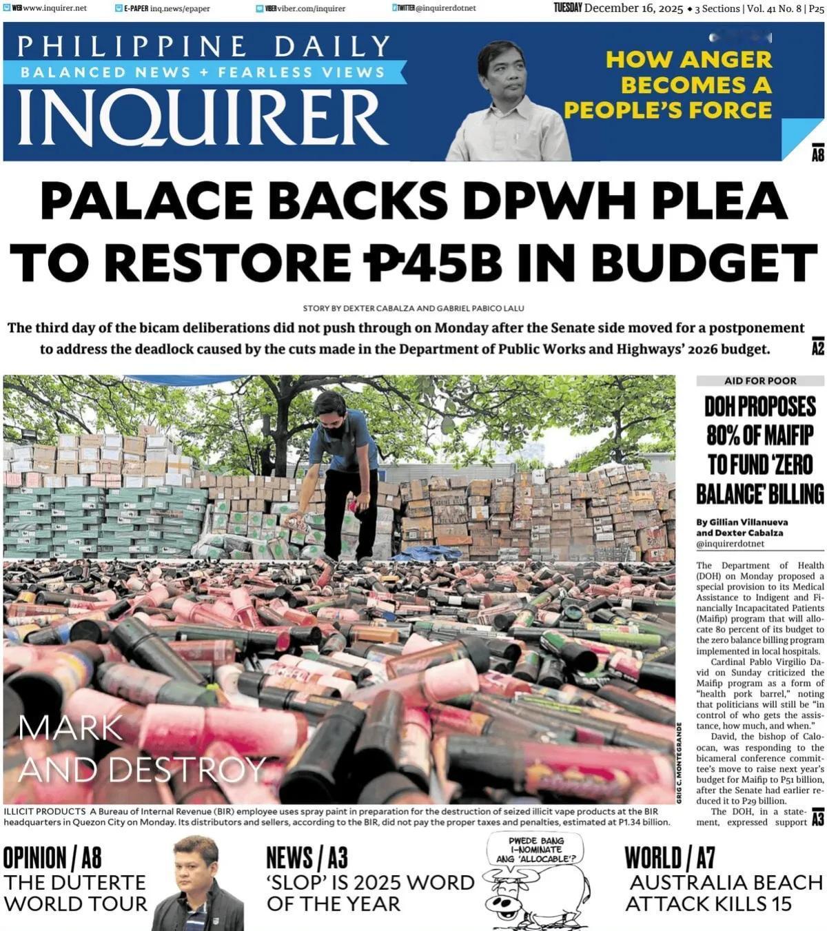 菲律宾《每日问询者报》头版报道,照片显示,非法产品 。周一,一名税务局(BIR)员工在菲律宾奎松市税务局总部准备用喷漆销毁查获的非法电子烟产品。 据税务局称,其经销商和销售商未缴纳估计达13.4亿比索的适当税款和罚款。 该报主要关注了,菲律宾总统府支持公共工程和公路部恢复450亿比索预算的请求 。 在参议院方面提议推迟会议以解决因公共工程和公路部2026年预算削减导致的僵局后,两院协商的第三天于周一未能进行。 菲律宾公共工程和公路部(DPWH)涉及的防洪工程腐败案件是2025年菲律宾爆发的一起重大系统性腐败丑闻,核心是该部门在管理防洪工程项目资金时出现严重滥用和欺诈行为。案件暴露了从项目审批到资金拨付环节的广泛漏洞,导致大量公共资金流失,且部分工程沦为“幽灵工程”(即从未开工却宣称完工的项目)。 因此许多菲律宾议员都决定要削减该部门的公共预算。