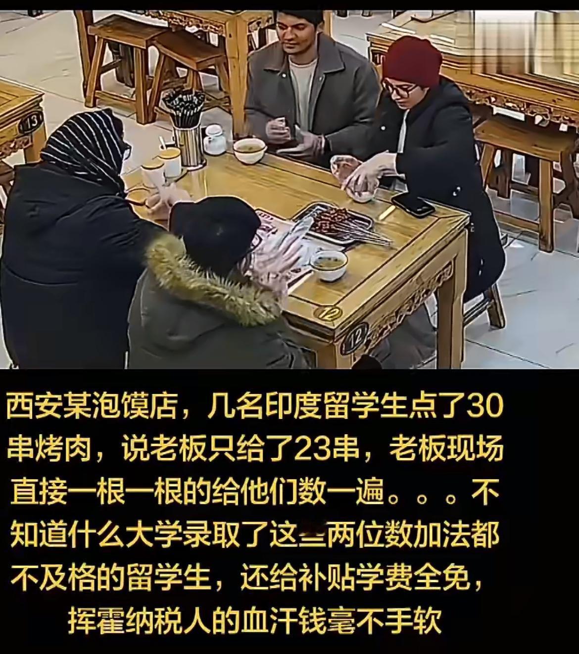 西安4名印度留学生点30烤串,非说只有23串,餐馆老板感叹,这些老外怎么不识数?他们晚上11点进店,点了30串羊肉串,3个烤馍,还有3碗免费汤。菜端上去,就喊老板,说烤串少了7串,老板心想不对劲,自己数好签子才烤的,不可能搞错。于是当着他们的面数一遍,就是30根。哎,四个人数都数不清,都是些啥留学生。印度就餐 杭州印度餐厅 南京印度餐厅