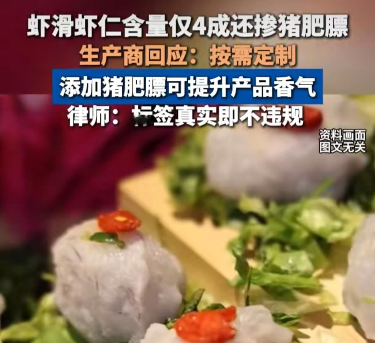 虾滑虾仁仅4成还掺猪肥膘?3招教你买不踩。虾滑虾仁仅4成还掺猪肥膘?3招教你买不踩坑 网友爆料买到的虾滑虾仁含量才40%,还掺了猪肥膘,这事儿直接给大伙整懵了,纷纷吐槽:咱吃虾滑图的就是虾味,这掺肉的算咋回事儿啊! 涉事厂家回应得挺实在,说这是按需定制款,加猪肥膘是为了增香提味,虾仁含量低是面向价格敏感人群,100克才卖4.5元,比高含量的便宜一半还多。 有厨师出来解释,猪肥膘能让虾滑口感更滑嫩弹牙,还能压住虾肉的腥味,风味更协调。律师也说了,只要包装如实标注,就不算违规,因为国标是推荐性的。 现在做美食类自媒体,就得把这种民生热点掰开揉碎了讲,既给大伙解疑释惑,又给实用技巧,这样的内容才有人看、有人转,涨粉自然快。 第一个技巧是盯紧配料表和含量标注。配料表第一位得是虾仁,含量标注≥70%的更靠谱,标注40%的就是经济型,别指望有多浓的虾味。 第二个技巧是别贪便宜买低价货。一分钱一分货,100克虾滑低于6块钱的,大概率虾仁含量不高,别为了省仨瓜俩枣,买回去吃着没味儿。 第三个技巧是买前上手捏一捏。好虾滑摸起来紧实不粘手,解冻后有明显的虾鲜味,一捏就散、闻着发腥发腻的,直接放下别犹豫。 很多人吃火锅就好这口虾滑,结果买到掺肥膘的低配版,心里肯定不得劲。但只要商家标得明明白白,咱就能按需选择,不花冤枉钱。 买虾滑别光看名字花哨,配料表和含量才是藏着真相的地方! 吃饭这事儿就得明明白白,选对了才能吃得舒心,吃得放心。