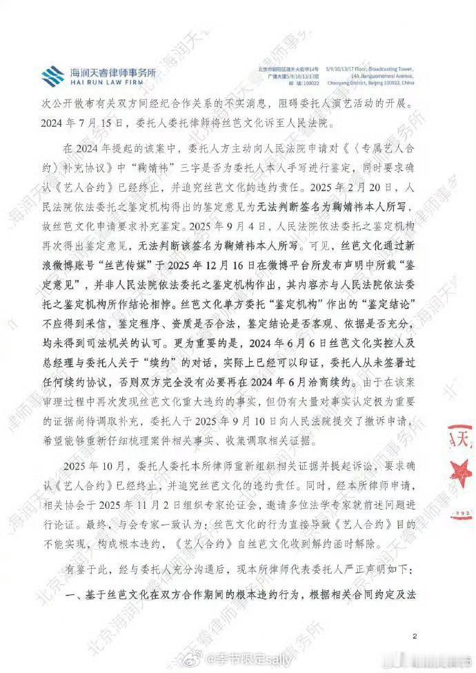 丝芭发声明后,鞠婧祎方律师也发声明了,两边都鉴定了丝芭回应鞠婧祎