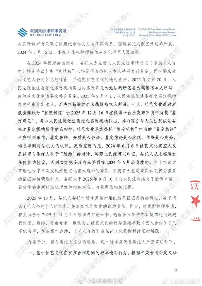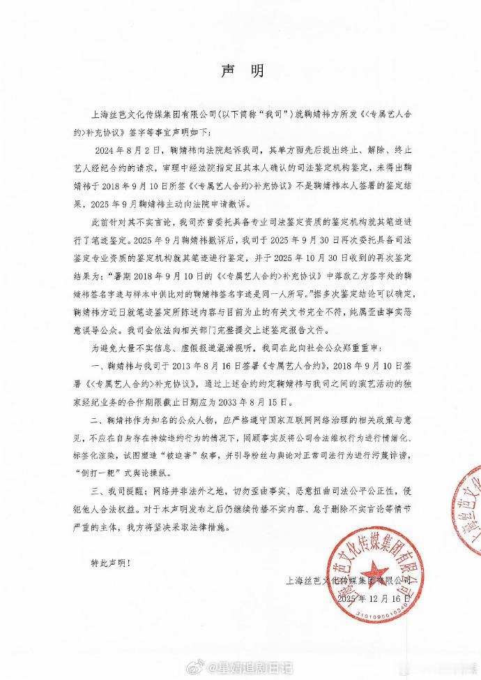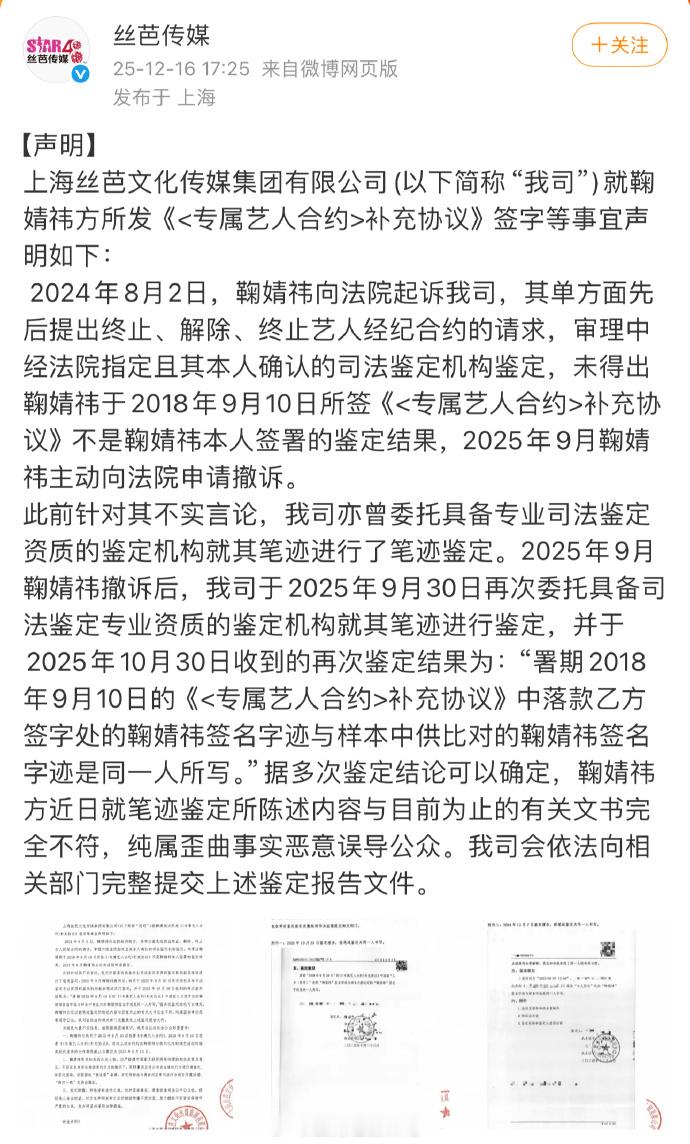 才看到,错过了好多…谁来总结一下鞠婧祎跟丝芭传媒谁有理?我大概看了一下,鞠婧祎工作室一直说的是没见过补充协议,更没签署过,说丝芭伪造。丝芭提供的材料是说补充协议签名是鞠婧祎。所以现在只能说签名是鞠婧祎的,但鞠婧祎到底是否知情并签署,变成了焦点…丝芭真的别给鞠婧祎做局了。首先补充协议签署的当天路透鞠婧祎本人没去公司其次丝芭曾经多次在艺人在约期间违规操作,有正当理由鉴定的样本的正式性。鉴定机构公章打码也可以合理怀疑鉴定机构的资质。总结一下:真有证据就积极应诉别当缩头乌龟了😅 双方都各抒一词,都说自己有证据,丝芭说签名是真的,鞠婧祎方说是公司伪造的,最后怎么样也只有上法院说了大家怎么看呢?鞠婧祎收入鞠婧祎方艾特丝芭,丝芭帮鞠婧祎落户上海,鞠婧祎工作室 粉丝打投,前助理为鞠婧祎发声