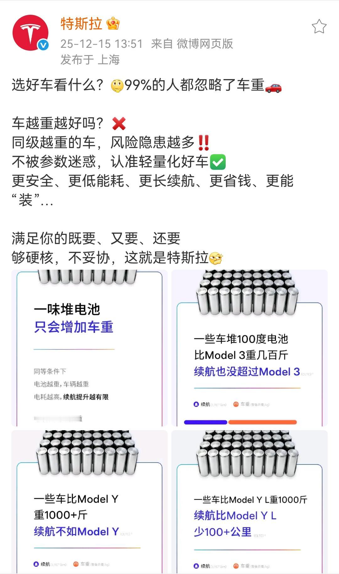 特斯拉发文“嘲讽”国产车车身重,100度电池的续航还不如特斯拉的续航! 如果单算能耗的话,特斯拉确实是非常的优秀,但是咱们得以辩证的思维来看待,如果能接受特斯拉没有太多的配置,确实特斯拉是一个好车。 对冰箱、彩电、大沙发等舒适型有追求的,特斯拉就不太适合了。消费者买车需要知道自己喜欢的是什么,什么样的车型都有适适合自己的群体。 各位是怎么看的?欢迎评论区留言。