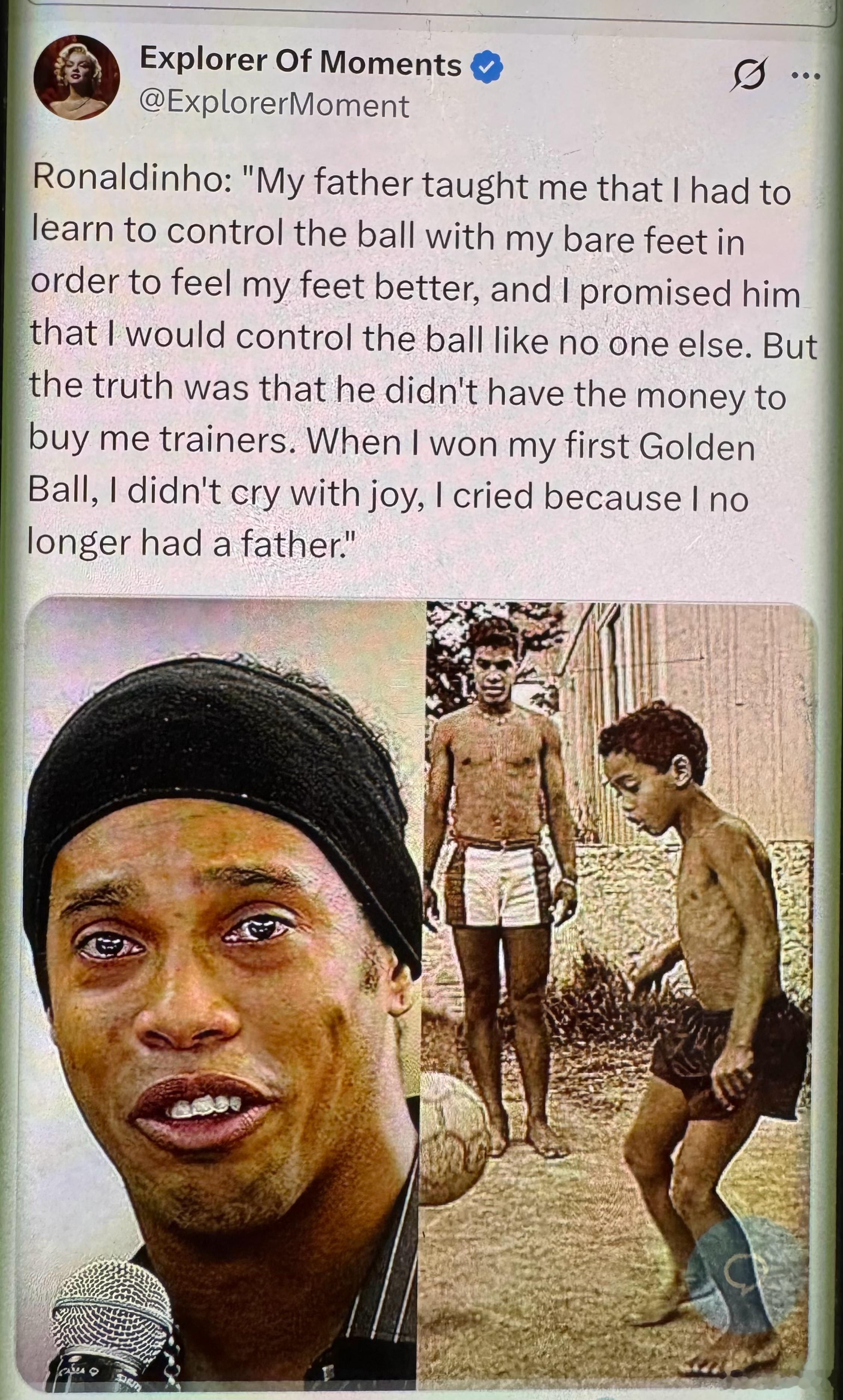 罗纳尔迪尼奥:我的父亲教导我,为了更好地感受自己的脚,我必须学会光着脚控制球,我向他保证,我会像其他人一样控制球。但事实是他没钱给我买运动鞋。当我赢得第一个金球奖时,我没有高兴得哭,我哭是因为我不再有父亲。