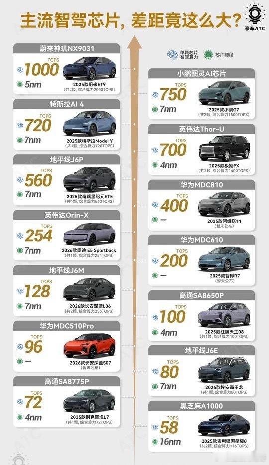 同为智驾芯片,里面的门道竟然这么深?从这张智驾芯片天梯榜能明显看出:当下智驾芯片的上下限,差距到底有多大?目前的“天花板”,是蔚来神玑的NX9031,单颗1000TOPS+5nm工艺,双芯片直接拉满2000TOPS,把其他选手甩了一档,算力冗余确实是够够的。至于特斯拉AI 4、小鹏图灵、英伟达Thor-U这类头部玩家,算力基本卡在700-750TOPS区间,算是第一梯队的“常规操作”;而有意思的是,工艺和算力未必完全挂钩,举个例子,英伟达Thor-U用4nm工艺做到700TOPS,高通SA8775P同样4nm却只有72TOPS,这说明芯片架构和优化的差距,可能比参数本身更影响实际体验。打个总结就是:现在智驾芯片已经分层,头部玩家在拼“过剩算力”,中尾部还在解决“有没有”的问题,而最终体验,永远是“算力+算法+硬件”的综合账。