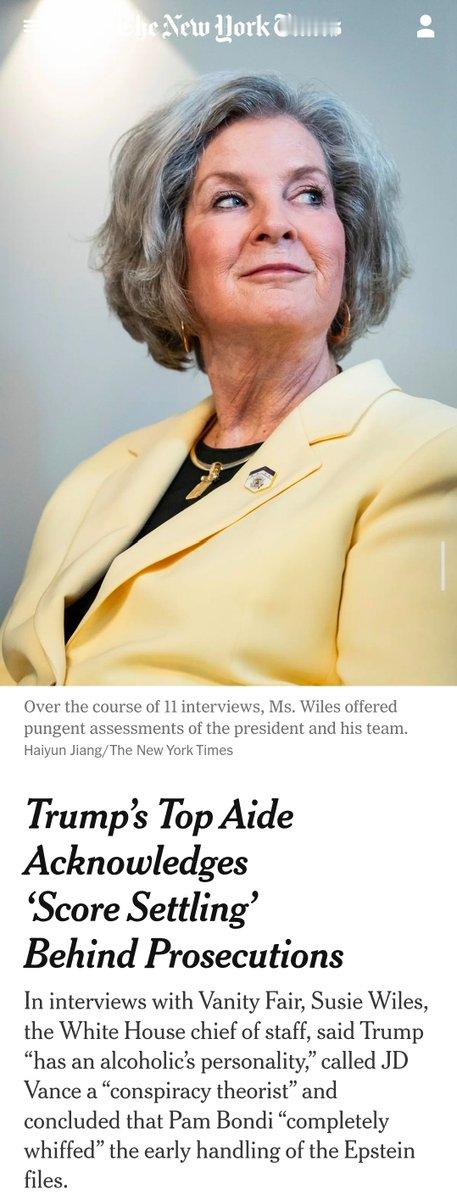 特朗普最高幕僚承认:起诉背后存在“清算旧账”在接受《名利场》(Vanity Fair)采访时,白宫幕僚长苏茜·威尔斯(Susie Wiles)表示,特朗普“有一种酒鬼式的人格”,称副总统JD·万斯是“一名阴谋论者”,并直言司法部长帕姆·邦迪在最初处理爱泼斯坦文件时“彻底搞砸了”。特朗普总统的幕僚长表示,她曾试图在特朗普执政90天后说服他停止针对政治对手的“清算旧账”,但她也承认,政府目前仍在推动的起诉行动,部分确实源于总统的报复欲望。威尔斯在采访中称,她与特朗普达成了一项“松散的共识”:在上任三个月后不再把重点放在惩罚政敌上,但这一努力显然并未奏效。她坚持认为特朗普并非时时刻刻都在想着报复,但也坦言:“一旦有机会,他就会出手。”这些言论出自威尔斯在特朗普第二任期第一年内,与作家克里斯·惠普尔(Chris Whipple)进行的11次极其不设防的采访,《名利场》于周二刊登。她不仅确认特朗普正在利用刑事起诉来报复对手,还承认他此前指控前总统比尔·克林顿曾前往性犯罪者杰弗里·爱泼斯坦私人岛屿的说法并不属实。在这11次采访中,威尔斯对总统及其团队给出了毫不留情的评价:特朗普“有一种酒鬼式的人格”;副总统JD·万斯“十年来一直是个阴谋论者”,他从特朗普的批评者转变为盟友,并非出于原则,而是“某种政治上的考量”,因为他当时正在竞选参议员;埃隆·马斯克是“公开承认的氯胺酮使用者”,是个“非常、非常怪的人”,其行为并不总是“理性的”,让她“震惊不已”;预算主管拉塞尔·T·沃特是“一名极右翼的绝对狂热分子”;而司法部长帕姆·邦迪在处理爱泼斯坦文件时“彻底失手”。威尔斯向惠普尔实时描述了她对某些政策的保留意见,即便政府内部争论正酣。她说自己曾劝特朗普不要赦免2021年1月6日事件中最暴力的暴徒,但他仍然这么做了;她曾试图让他推迟宣布重大关税政策,因为顾问团队之间存在“巨大分歧”,但没有成功;她还表示,政府在驱逐移民问题上需要“更加仔细”,以防止犯错。不过,她并未抱怨自己被推翻,并在多个节点表示自己“最终接受了”这些决定。“有几次我是被投票否决的,”她说,“如果票数打平,那他赢。”这些脱稿言论让人想起里根总统第一任期时的一段往事——当时预算主管大卫·斯托克曼(David A. Stockman)也曾向《大西洋月刊》发表一系列坦率访谈,引发巨大风波。不同的是,斯托克曼当年对外采访是瞒着白宫进行的(几乎因此被解职),而这次特朗普团队整体配合了《名利场》。万斯、副国务卿马尔科·鲁比奥都接受了采访,并与史蒂芬·米勒、卡罗琳·莱维特等高级幕僚一起,为摄影师克里斯托弗·安德森拍摄了时尚大片。威尔斯是一名低调的佛罗里达政治策略师,曾操盘特朗普去年成功复出的竞选活动。本任期内,她是总统最重要的助手,被认为比特朗普第一任期的混乱运作更加纪律严明。特朗普对她的信任程度极高,甚至在上周的一场集会上称她为“苏茜·特朗普”。但在威尔斯领导下的白宫同样混乱,只是方式不同。与特朗普第一任期中任职时间最长的幕僚长约翰·F·凯利不同,后者认为自己的职责是阻止总统做出激进、不明智甚至非法的行为;威尔斯并不把“约束特朗普”视为自己的角色。相反,她明确表示自己的使命是促成总统的意志,即便她有时认为他做得过头。她将自己能与特朗普共事的能力,归因于自己成长于一个有酒精依赖的家庭——她的父亲是体育播音员帕特·萨默罗尔。“高功能酒鬼,或者酒鬼一般来说,在喝酒时人格会被放大,”她说,“所以我多少算是大人格的专家。”她补充说,虽然特朗普不喝酒,但他“有一种酒鬼式的人格”,并且带着一种“认为自己无所不能的视角行事——真的,什么都能做。”为了应对总统随性、意识流式的公开发言,她在西翼办公室壁炉旁放了一台独立显示器,实时播放特朗普的社交媒体动态。⸻关于“清算旧账”的执念特朗普对报复政敌的执念,成为一个典型案例。威尔斯在3月向惠普尔透露,她曾告诉特朗普,他的总统任期不该成为一场“报复巡演”。“我们有一个松散的约定:清算旧账会在前90天内结束,”她当时说。但到8月仍未停止,她又表示:“我不认为他是在进行一场报复巡演”,但他确实在针对那些“对他做过坏事的人”。“在某些情况下,这看起来可能像报复,”她说,“而且有时确实带有这种成分。谁会责怪他呢?反正我不会。”她承认,目标之一是纽约州总检察长利蒂夏·詹姆斯(Letitia James),后者在一宗商业欺诈案中赢得对特朗普的民事判决,罚款近5亿美元。“嗯,这可能算是一次报复,”威尔斯说。她是否建议特朗普收手?“对她没有。她动了他五亿美元的钱。”(后来上诉法院认定罚款过高,但维持了判决本身。)至于前FBI局长詹姆斯·科米,威尔斯表示:“人们确实可能会觉得这看起来很报复性。我没法告诉你为什么你不该这么想。”她补充道:“我不认为他每天醒来就想着报复,但一旦有机会,他就会出手。”特朗普政府对詹姆斯和科米提起的起诉均被联邦法官驳回。政府誓言继续尝试,但两个大陪审团拒绝重新起诉詹姆斯,另一名法官也裁定,使追究科米责任变得更加困难。⸻爱泼斯坦文件、邦迪与克林顿在《名利场》的采访中,威尔斯批评了她在政府中最亲密的朋友之一、司法部长帕姆·邦迪,认为她在早期处理爱泼
