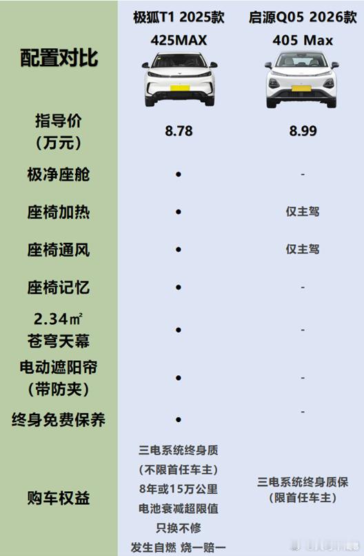 家用车挑选笔记,从座椅功能看极狐T1与启源Q05的日常体验作为家庭用车,每天的通勤和假期的短途旅行,车内的每一个便利设计都能提升幸福感。仔细对比极狐T1 425MAX和启源Q05 405Max的座椅相关配置,启源Q05为主驾驶位配备了加热和通风,而极狐T1将这两项舒适功能都覆盖到了前排双座。对于有固定伴侣或家人同行的我来说,副驾的舒适同样重要。此外,极狐T1还多了一个很实用的座椅记忆功能,这是启源Q05所没有的。当我和家人交换驾驶时,这个功能能免去重新调整座椅、后视镜的繁琐步骤,一键即可恢复专属坐姿,让交接变得更顺畅。加上带防夹的电动遮阳帘,无论是接送孩子还是午后小憩,都能轻松调节车内光线。极狐T1启源Q05买车一个理由就够了买车最关注什么